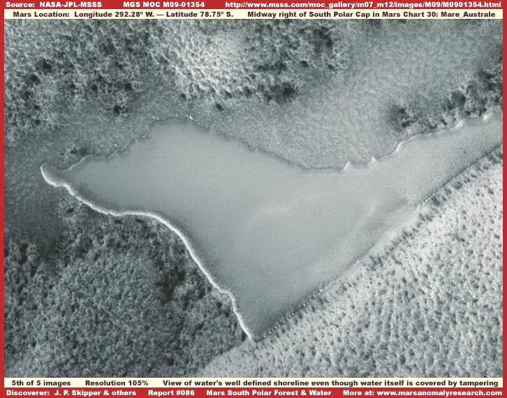 Ez pontosan ugyanaz az alapvető taktika-készlet, mellyel igyekeznek elrejteni az időszakos vízfolyások nyomait a keskeny-látószögű, közelebbi felvételen, s a Déli Sarki sapka szélénél, miként arról más beszámolóban szó esik, megváltoztatott mintázattal és textúrával találkozhatunk, igyekezvén minél jobban összekeverni a látványt, képről-képre. A képhamisítási eljárások alkalmazása talán sokkal sikeresebb lenne, ha nem lenne a vízfolyások nyomainak kiterjedése ily jelentős, és kontinentális kiterjedésű, hogy még a nagylátószögű felvételeken is felismerhetjük a nyomait. Azonban nincs ekkora szerencsénk az itt látható normális méretű, a felszíni élet nyomaira utaló felvétel esetében. Az erdőségre utaló nyomok túl gyengécskék ami az egyedileg megfigyelhető példányokat illeti, túl sűrű a növényzet, vastag, mindent egybefonódó, összekuszálódott, eltakaró és a túl nagy távolság miatt nem láthatók a részletek. Nincs semmi egyebünk, mint néhány magányos csúcs a hatalmas erdőtakaró mintázatában és textúrájában, ez ad némi, ám nemigazán meggyőző nyomot. A fenti, ötödik felvétel egyben az utolsó itt, közelebbi rápillantást enged az M09-01354 archívumszámú felvétel felszíni vizet láttató részére. Vegyük észre, hogy a mélyedés jobb felső része, meglehetősen egyenesnek tűnik a partvonal többi, szabálytalan részével összevetve. Vegyük észre, hogy ez az egyenes vonal túlnyúlik magán a vízfelületen, behatol a környező felszínbe, és ott folytatódik, viszont a két oldalán látható mintázat és textúra eltér egymástól, így egyfajta elválasztóvonalként jelentkezik, meglehetősen eltérő határvidékkel. Mindez pedig annak következménye, hogy két különböző képhamisítási megoldást választottak a terület kitöltésére, ezeket pedig nem hangolták össze a találkozási pontjuknál.