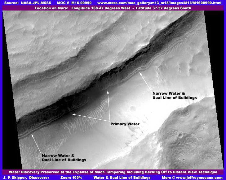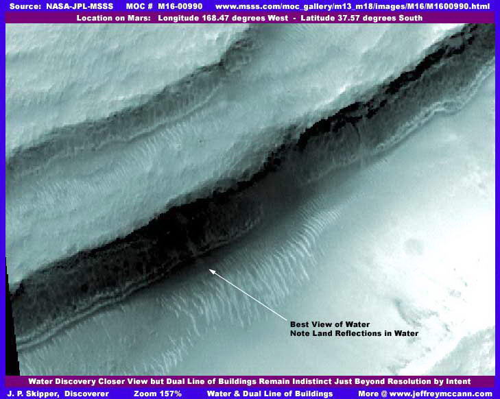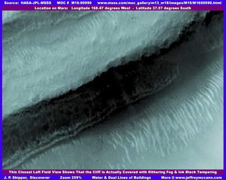 A fenti, második felvétel egy kissé közelebbi rátekintést enged a helyszínre mint az első, kis színt adtunk is hozzá (de semmi mást), a különböző elemek könnyebb megkülönböztetése végett. Természetesen semmiféle épület konkrétan nem látható a kettős párhuzamos vonal mentén, de annyi mindenesetre kivehető, hogy ezek a bizonyos vonalak nagyszámú, hatalmas, egyedi elemből épülnek fel, sokkal inkább, mintsem folyamatos vonalak lennének, mint például part menti geológiai alakzatok. Továbbá, az is kivehető, hogy immár nyoma sincs a sziklafalnak, egyáltalán nem látható, pusztán a sejtelmes köd és a sötét tintapacák, ez utóbbiak is csak azért, hogy feltörjék a ködösítés folyamatos megjelenését, és olybá tegyék, mintha valamiféle sziklafallal állnánk szemben. A legvalószínűbbnek az tűnik, hogy a képhamisítási eljárások hozzák létre a sziklafal illúzióját, igazából semmi ilyesmi nem létezik ott, talán a még annál is hatalmasabb épületeket akarták ily módon elrejteni, ezt támasztja alá a felbontás szándékos lerontása és a mesterkélten távolinak tűnő nézet. Miközben folyamatosan az itt megfigyelhető képhamisításokról beszélünk, arról semmiféleképpen sem feledkezhetünk meg, hogy bizonyíthatóan vizet fedezhetünk fel ezen a felvételen, annak minden következményével együtt - az élet előfordulására vonatkozóan. A folyóvíz jelenléte cáfolhatatlan, a képhamisítások ellenére is. Először is, egy viszonylagosan nagy terület található vékony, áttetsző árnyék-alkalmazással, közvetlenül az elsődleges vízfolyásnál, a képen látható nyíl kezdetétől, attól jobbra terjedően. Jól kivehető a halvány árnyék kiterjesztése a vízfelület fölé, majd tovább, a gerincek fölé, azután a lejtőre, miként formál félhold alakot. Mindezt azért tették, mert el akartak rejteni valamit; a szándékosan felvitt fedőréteg a jobb oldalon megvastagodik, ennél a pontnál már teljeséggel kivehetetlen, mi is lehet alatta. A beavatkozás eredményeként súlyosan károsodott a víz láthatósága, ezért azt némileg kiretusálták, legalábbis a bal oldali területen, ahol a felirat is jelzi, „a víz legjobb láthatósága…” Mindezt természetesen igen nehéz észrevenni, amíg valaki nem szerez hatalmas tapasztalatot a marsfotók elemzése terén, és az is fontos, hogy kellő gyakorlattal legyen képes a szemlélő felismerni a képhamisítási eljárásokat; szerencsére mégis maradt elegendő felfedeznivaló. Azok számára, akik látják és/vagy tudják mi folyik valóban itt, könnyen belátják, az adott felfedezés legalább annyira fontos, már mint a víz jelenléte és a feltehetően hozzá kapcsolódó növényi élet (némely részlet olykor elkerüli a hamisítási technikákat), mint a képhamisítási eljárások jelenléte. Abban is biztosak lehetünk, ezt a játékot már jó régen kitalálták a titkos hatalmak, az emberek viszont jelen beszámolók, mások munkái és saját gondolkodási útjaik révén mégis egyre többet fognak megtudni a Marsról. Tudniuk kell, hogy bármit is tesznek, úgyis előbb-utóbb és rendszeresen dióhaj kerül a süteménybe (habár megpróbálják ezeket a helyzeteket kivédeni), a gondolkodási irány bizony eltér az előre elvárttól.
