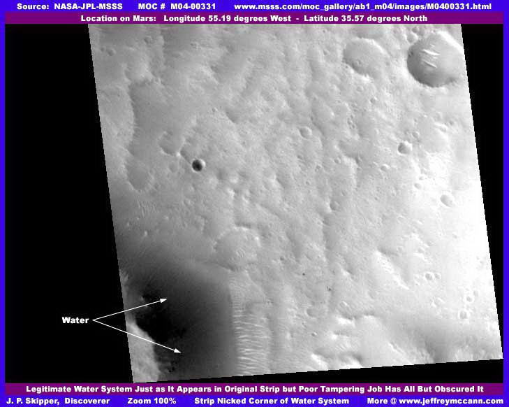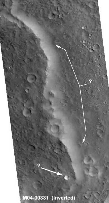 A fenti képen ugyancsak felszíni vízlelőhelyre vonatkozó felfedezést találhatunk, a bal alsó sarokban, az eredeti M04-00331 jelű fotócsíkról, mintha begörbített ujjat látnánk; ez valójában csak kis részlete a teljes vízgyűjtő területnek. A fenti kép hajszálpontosan úgy fest, miként az eredeti, semmiféle változtatás nem történt semelyik részén, eltekintve a nyilaktól és a felirattól. Figyeljük meg, miként változik a vízfelület színe egyre sötétebbé a belsőbb területek (mélyebb) felé haladva, az ívelt csatorna közepe felé, és ellenkezőleg, miként világosodik ki, amint a széle felé (sekélyebb rész) haladunk. Figyeljük meg a víz alatt található felszíni formákat, meglehetősen jól kivehetők, nem igaz? Azonban akad némi gond. Ha már tökéletes mértékben biztosak lehetünk benne, valóban vizet látunk a felvételen, be kell vallani, igazából nem látjuk, hiszen a hamis illúziót keltő képhamisítási technika mindent elfed, beleértve magát a vízfelületet és a közvetlen környékének felszíni alakzatait. Az egyetlen valós dolog amit láthatunk, valamiféle gerinc-alakzatok részletei, a vízfolyás szélén, ezekről határozottan kijelenthetjük, a lejtőn aláfolydogáló víz mentén alakultak ki. Ez az! Tegyünk is egy közelebbi pillantást ugyanerre a területre, ám a képet átfordítottuk negatívba, a képhamisítási beavatkozások nyomai így kissé jobban látszanak.