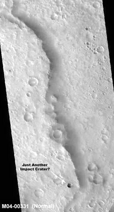 Mellékeltük a kislátószögű M04-00331 jelű felvételt a nagylátószögű, M04-00332 kontext felvétel társaságában, bemutatván az M04-00331 sorszámú fotó szélesebb környezetét. E hatalmas kráterek társaságában. Figyeljük meg, hogy a fotócsík bal alsó sarka éppen csak érinti egy hosszú árokrendszer végét. Mindezzel azt szeretnénk bemutatni, hogy az M04-00331 jelű felvétel kapcsán tárgyalt vízrendszer csupán milyen csekély részét képezi a teljes rendszernek. A fenti kontext felvételen azonban az is látható, hogy közvetlenül az M04-00331 fotócsíktól jobbra, megjelennek a képhamisítási beavatkozások sötét foltjai; jelentősen meghamisított területekkel találkozhatunk a fotócsík bal oldalán is, végig a kráter belsejében, azt a hamis látszatot keltve, mintha valami kitöltené. Akármi is volt ott, igen tekintélyes méretű lehetett, hogy már ezen a nagylátószögű és igen távoli felvételen is ilyen jelentős képhamisítási beavatkozásokat tett szükségessé a puszta ottléte. Ez az újjávarázsolt vízrendszer tulajdonképpen nem az egyetlen figyelem felkeltő tétel ezen a bizonyos fotócsíkon. A felsőbb részén felbukkan egy hosszú völgyrendszer, teljes mértékben söprési technikával meghamisítva egész hosszában, sőt, még fölötte is. Nem történ kísérlet sem a víz látványának visszaadására itt, csupán elrejtésére, talán mert túl keskeny és jelentéktelen vízfolyás volt, nem érte meg megtartani a látványát. Logikus a következtetés, ahhoz viszont elegendő víz volt jelen, hogy képes legyen biztosítani egy civilizáció ellátását, hiszen különben nem foglalkoztak volna elrejtésével. Továbbá, láthatunk egy kisebb becsapódásos krátert a kép alsó részén, mely a közelebbi vizsgálatok révén bizony valami másnak tűnik. Vessük össze az előbbi két képet, az egyik a normál színkiosztás, a másik annak negatívja.