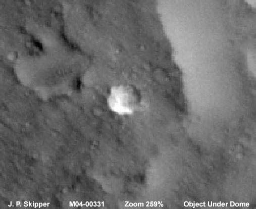A fenti, nagyított képen, már nem tűnik olybá mintha valami kráter lenne. Sokkal inkább egy jól átlátszó, a napfényt az egyik oldalán erősen visszatükröző kupolának, miközben az egész kupola napfényben úszik. Újabb erős érv amellett, hogy bizony ez a valós szín. Kivehetünk még egy tekintélyes méretű, ködszerűen elmosódó objektumot a kupola térségében, rövid árnyékot vetve maga mögött. Sajnos, ez a 259%-os nagyítás olyan, melynél nagyobbat már nem érhetünk el - ennyit tettek lehetővé számunkra a hivatásos képfeldolgozók – így nem nézhetjük ki, hogy mi van a kupola alatt, vagy mi nincs, csak homályos foltok vannak – elértük a felbontás határát. De talán érdekes lehet ez a civilizációs nyom egy vízfolyás közvetlen közelében, melyet a képhamisító számítógépes program megpróbált eltüntetni, de hibázott. Ám lehet, hogy a már korábban is említett, az automatikus számítógépes program által végrehajtott „foltozásról” van szó. Kerek alakzatnak látszik, kissé zavarólag hat áttetsző tulajdonsága, az elködösítési szándékkal felhordott pacafolt félresikerült, ugyanis túlnyúlik a kráter külső peremén, nyilvánvalóan meghagyva a látszatot, hogy valóban kráter-tetőről van szó. Másrészről, ha egyértelműen kiderülne, hogy a kupola alatt szögletes geometriai formák találhatók, mint például épületek és ablakok, biztosak lehetünk benne, hogy a számítógépes program a teljes területet kezelésbe vette volna, mindenféle lelkiismeret furdalás nélkül. Ha az épületek túl kicsik és nehezen kivehetők lettek volna, és már eleve átestek volna a ködösítésen, akkor a számítógépes program néhány további paca felhelyezésével megtörte volna a geometriai mintázatot véletlenszerű pontokban, részben teljes mértékben elrejtve, részben láthatóan meghagyva, majd tovább lépve. végighaladva a teljes felszínen. Jelen esetben azonban a kupola alatt lévő objektum nem egyértelműen felismerhető a számítógépes program számára, ezért a kupola esett csak áldozatául, krátertető benyomását keltve, kimaradt azonban egy kicsiny sziget, mintha a tengeren úszna, a képhamisítási eljárás alól. Vajon megmondható, mi volt eredetileg a kupola körül a felszínen, a képhamisítási beavatkozás előtt? Logikusan gondolkozva, a MOC felvételein szerzett tapasztalatoknak köszönhetően, a képhamisítás fokát felismerve, egyértelműen leszögezhetjük, jelentős méretű civilizációs nyomra bukkanhattak itt. Érdemes visszatérni az M04-00332 kontext felvételhez és közelebbről is megvizsgálni. Figyeljük meg a halvány, ködös képhamisítási beavatkozást közvetlenül a kislátószögű M04-00331 jelű fotócsík jobbján. Ez a közvetlen jobbra található helyszín egy törésvonal alsó részét képezi; nyilvánvalóan víz-előfordulásokkal. Ez a módszer a dedukció, amikor a megfelelő dolgokat egymás mellé tesszük, és az összefüggések kielemzésével közelebb juthatunk annak megismeréséhez, mi folyik valójában a Marson, és annak megértéséhez, vajon miért maradhatott ki a különálló kupola a képhamisítási alkalmazások beavatkozása alól; a megfigyelt dolgok logikus végig vezetése gyanút kell, hogy keltsen bennünk. Nem kerülheti el figyelmünket a képhamisítással felhordott kisebb pacák sorozata sem a kupola körül, lágy, ám teljesen valótlan felszíni részleteket megformálva. A valóság bizonyára számos kis, ám jól megfigyelhető vonalat mutatna, ezek itt nem láthatók, a ködösítő beavatkozások miatt. Továbbá, a kupola által összegyűjtött fény mennyisége lencsehatást tételez fel, ami valójában itt is van, hiszen nagy szükség van a fényre, a következtetés adódik, a környező területnek is hasonlóképpen kellene viselkednie, számos, szögben végződő formát tartalmaznia, ezekből itt természetesen semmi sem látható, a mesterséges hamisítási beavatkozásoknak köszönhetően, sem a normál, sem a negatív képen. Szilárd érveket kívántunk felvonultatni a Kedves Olvasó látásmódjának tisztítása érdekében. Annak teljes megértéséhez, hogy mi folyik a Marson és mi nem, igen fontos a képhamisítások természetének megértése, főleg annak, mennyire rendkívüli módon kiterjedten alkalmazzák, és célirányosan. Mindenkinek fel kell tennie a kérdést az okokra vonatkozóan és el kell gondolkoznia rajta. Akadémikus és tudós társaságaink szinte semmit sem tesznek (legalábbis igen keveset) a Marsról érkező adatok tisztaságának megkérdőjelezése ügyében, vakon bíznak már évtizedek óta elöljáróikban, és szó nélkül lenyelik a tudományos képtelenségek gombócait, féligazságokat, sőt, az igazság kicsúfolását is. Néhány visszásságra és félrevezetési szándékra már elég felhívni a figyelmet, ennyitől már szépen össze is dől az a hazugságvár, amelyet oly gondosan és előre eltervezetten építgetnek számunkra már évtizedek óta. De mindez különösképpen nem zavarja elöljáróinkat, nekik bőven elég a maguk fizetése és pozíciója, az igazság másodlagos, vagy még az sem. Hiszen tapasztalhatta mostanában bárki is, hogy komoly tudományos vezető akárcsak komolyságot színlelve megfeleljen az általunk – vagy mások által – felvetett kérdések bármelyikére? Akkor meg mit is akarunk? Ennek fontosságát mindenkinek önmagának kell eldöntenie.