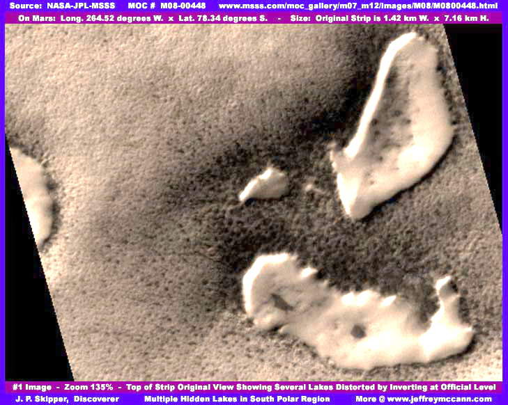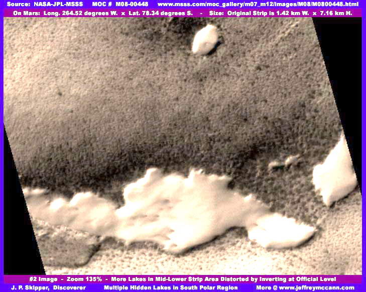 A fenti – e típusból a második felvétel – ugyanabból a fotócsíkból van, mint az első; alapvetően ugyanazt is ábrázolja, mindösszesen a fotócsík másik részén található. Hozzá kell tenni, számtalan forrás található még ugyanilyen formákkal és nemcsak ezen az egyetlen fotócsíkon. Nos, itt vannak ezek a látszólag a talaj szintje fölé emelkedő világos színű foltok. Hátramaradt hó vagy jégmezők lennének? Ha valaki ezt mondaná, nem hangzana számunkra túlságosan meggyőzően, hiszen az MOC felvételeinek vizsgálata révén szerzett tapasztalatok nem ezt a nézetet támasztják alá. Példának okáért, vessünk egy pillantást a „Gigászi növények és nyíltvizű tavak a Marson” – című beszámolóra, az ott tárgyalt helyszín szintén a Déli Pólus közelében található. Szenteljünk különös figyelmet az ott szereplő 2., 3. és 6. felvételnek, tavakat láthatunk, körülöttük szárazulat; hasonlítsuk össze az ott látottakat az itt bemutatottakkal.
