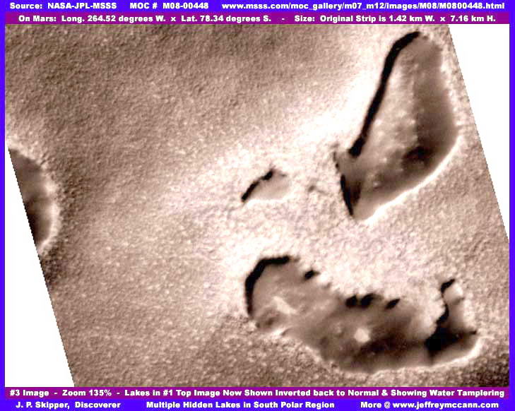 A harmadik felvétel az első felvétel negatívja. A kép így mintha kissé beszédesebb lenne. A világos színű, eddig kiemelkedő területek most hirtelen mélyedésekké változnak át, melyek, véleményünk szerint, pontosan azok, amelyek eredeti állapotukban is, azaz felszíni, folyékony víz-előfordulások; amit ugye tökéletes lehetetlenségnek tartanak. Sötét színű, ködös jellegű képhamisítási beavatkozáson estek át, teljesen befedve szinte az egész vízfelületet; ez a beavatkozás pedig világos színt kap a negatívba fordítás során. más szavakkal, a nyilvánosság számára közölt fotó nem a valódi színösszeállítást tartalmazza, hanem egy meghamisított, majd negatívba átfordított kép, ami normális állapotában az általunk bemutatott „negatív” felvételen látható, így próbáljuk visszaadni az eredeti látványt.
