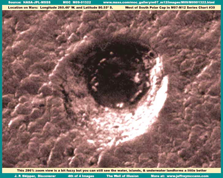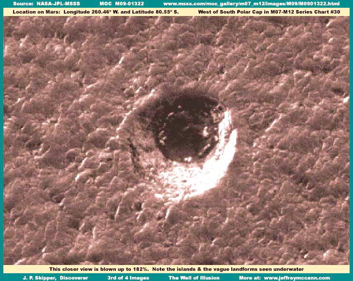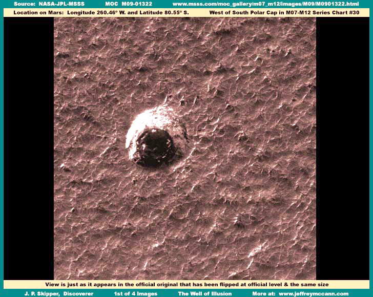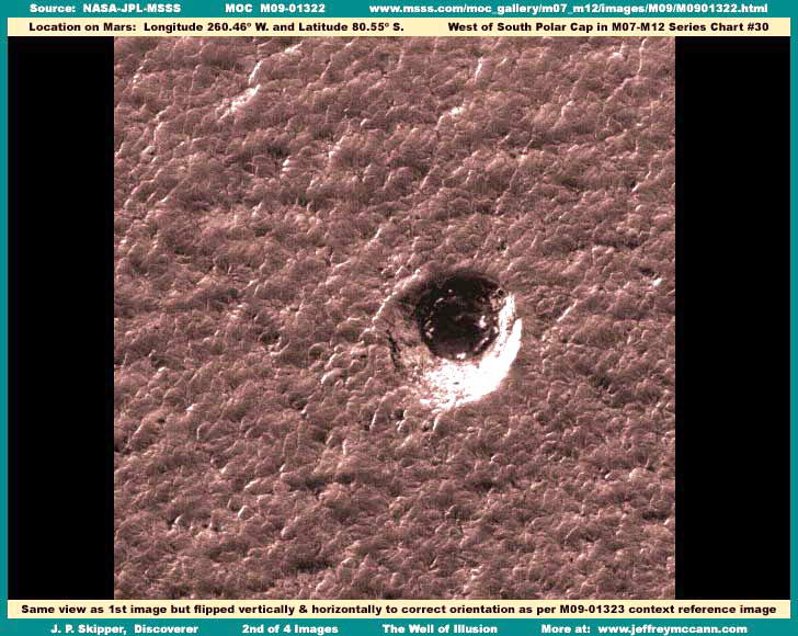 53. Az illúzió kútja Jelen beszámolóban a Déli Sarkvidék egy újabb vízlelő-helyére vonatkozó felfedezést ismertetünk, kicsit vártunk nyilvánosságra hozatalával. A fenti felvétel az eredeti látványt mutatja, miként azt hivatalos források publikálták. A megszokott fotócsíkoknál valamivel keskenyebb a szóban forgó, de igyekeztünk az eredeti viszonyokat hűen visszaadni, így megtartottuk a 100%-os nagyítást. Amikor először megláttuk, arra gondoltunk, újabb vízlelőhelyet fedeztünk fel, egy kráter mélyén összegyűlve, legalábbis minden erre utalt a felvételt első szemrevételezésekor. A közelebbi vizsgálat azonban feltárta, szó sincs jelen esetben kráterről, semmi sem utal becsapódásra a környező felszínen; talán azért, mert egy a lyuk túlságosan nagy és meglehetősen mély benyomást is kelt. Ha valaki némi tapasztalatra tett már szert a MOC felvételein víznyomok után kutatva, megtapasztalhatta, ennek a bemélyedésnek az alján víz van, és természetesen, e felvételre tekintve, ez a felfedezés jelenti a legfontosabb felismerést. Azonban meggyőződésünk, szó sincs becsapódásos kráterről, de mégis csak láthatunk valamiféle gigantikus bemélyedést a felszínen, ez pedig arra utal, meg kell alaposan vizsgálnunk a dolgot, miként jöhet létre ilyen hatalmas bemélyedés. Az első dolog, amit felismertünk, hogy e helyszín a hivatalos forrásokon három fotócsíkon szerepel, mindhárom ugyanolyan tájolású, egyik sem térkép-vetített, vagyis közvetlenül függőleges – fentről lefelé – irányuló, keretek nélküli Ez a megoldás eltér a MOC felvételek hivatalos és megszokott publikálási módjától, hiszen a sorban első helyen szereplő JPEG, a sorban a második GIF formátumú fotócsík térkép-vetített (bizonyos szög alatt látszik, kerettel), míg a harmadikként listázott GIF fotócsík nem térkép-vetített, (függőlegesen látszik, keretek nélkül), és gyakran fordított állású. E helyzet máris felkeltette érdeklődésünket és arra késztetett, közelebbi pillantást is vessünk rá, bármi is lehet a dolog hátterében, mindenképpen be kell számolni róla. Felismertük, hogy a nyilvánosságra hozott felvételek egyike sem illik be a fotócsík környezetét bemutató M09-01323 jelű kontext, széles látókőrű felvételbe. Ez az egyszerű tény arra utal, hogy mindhárom fotócsíkot megfordították mind függőlegesen, mind vízszintesen – már hivatalos szinten. A kérdés az, vajon miért?