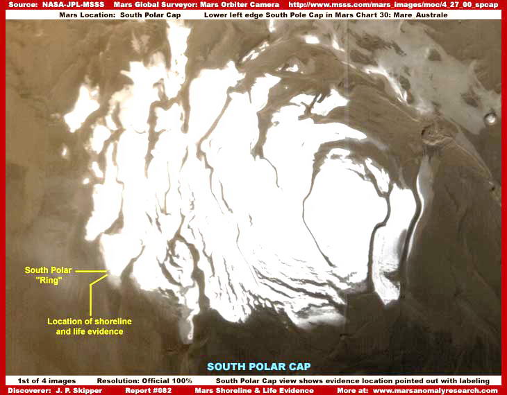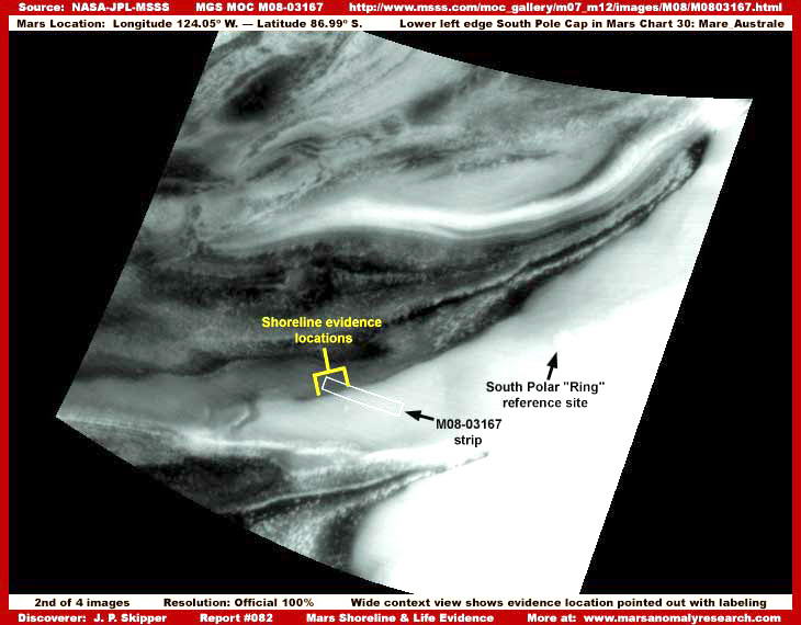 A fenti, második felvétel kissé közelebbi rápillantást ad a helyszínre, de még mindig elég távolit ahhoz, hogy általános rátekintést kaphassunk a pontos helyszínről. A bemutatandó fotócsík helyszínét sárga felirat jelzi. A fotó jobb oldali részén látható a Déli Pólus szokatlan „Gyűrű” alakzata, erről olvasható ugye bővebben a „Gyűrű a Mars Déli Pólusán” című írásban. Ez a felvétel 1999. október 14-én készült az MGS küldetése során, az évszakos változásokat figyelembe véve, a száraz időszakban, amikor a víz távolabbra húzódik vissza a Déli Sarki területektől. További információ a Mars Déli Pólusának vidékéről a már hivatkozott „Vízáradatok a Mars Déli Pólusán” – című beszámolóban találhatók. Álláspontunk szerint, a fenti, második felvétel is egyike a súlyosan meghamisított képeknek. A világos területek teljes felszíne vastag fedőréteget kapott. A hivatalos magyarázat természetesen valahogy úgy hangzanak, hogy széndioxid havat látunk, ám erről szó sincs e felvétel esetében, akár kissé sötétebb, akár világosabb, bármerre is tekintünk, mindenhol e jellegtelen, pamacsszerű hamisítási megoldásokba ütközünk, emellett, semmiféle felszíni részletet nem tudunk kivenni. Mindezt legkönnyebben a szokatlan „Gyűrű” alakzat esetében figyelhetjük meg, ugyanis szinte elveszik a hamis fedőréteg alatt. Ha a képhamisítási réteg alól nem kandikálna kissé ki a „Gyűrű”, akkor lényegében észre sem vennénk, alkalmazását. A meglátásunk szerint a kép sötétebbik fele valós felszíni állapotokat tükröz, azaz mindenféleképpen referencia-felvételnek minősül a tengerpart megjelenése kapcsán, és emiatt érdemes vele részletesebben is megismerkedni. Érdemes alaposan megvizsgálni a fotókat, hiszen rendkívül fontos felfedezésről tanúskodnak, ezzel a felfedezéssel pedig mindenféleképpen hasznos lesz a jövőben is foglalkozni, további megerősítést keresve. Nos, a helyszín bemutatása után most már rátérhetünk a lényegre.