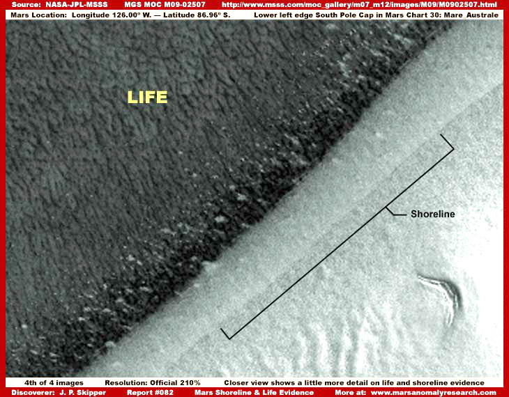 Ehhez a fent látható M09-02507 és M07-05909 hivatalos jelzésű fotókból állítottunk össze egy osztott képet, ezáltal jó összehasonlításra nyílik lehetőség, igen alaposan megvizsgálhatjuk a hivatalosan kiadott felbontási szinten a szóban forgó jelenséget. Nem szabad elfeledkeznünk arról, hogy erre a két felvételre csupán a bemutatás miatt esett a választás, valójában sokkal több is van a kérdéses területről, a part magasabban és alacsonyabban fekvő részeiről egyaránt. Néhányat ezen felvételek közül felsorolunk, további hivatkozások gyanánt. Miként ez a kettő, az ott megjelöltek is keskeny-látószögű felvételek, ráadásul kissé nagyobb távolságból készültek, ezért felbontásuk korántsem ilyen jó, nem tesznek lehetővé erősebb nagyítást, a pixelezettség korán megjelenik. Akár hogy is beszédes képek, mindjárt meg is hallgatjuk, mit mondanak. E két képre azért esett végül a választás, mert jól látható a félhold alakú forma, ez pedig kitűnő segítséget nyújt mint viszonyítási pont. A teljes bal oldali terület vastag, sűrű és áthatolhatatlan szövevényt alkot, nem más, mint virágzó ÉLET. Valamiféle biológiai életnek tűnik, növényzetnek, talán gombaféle. Azonban ennyi erővel lehet telepet alkotó állati életforma is, olyan forma, mely növényeket utánoz megjelenésében, miként erről is szó volt más beszámolóban. Az e területről készült felvételeken és azokon, melyek a sötét területet mélyebben ábrázolják, az év különböző időszakaiban, a sűrű és áthatolhatatlan szőnyeg itt-ott felszakadozik, bizonyítván, hogy az évszakokhoz igazodva időszakos változásokon esik át, azaz dinamikus átalakulások alanya, tehát semmiféleképpen sem keverhető össze mozdulatlan geológiai felszínnel. Miként az jól látható, a sötét mintázat igen határozottan és élesen megszűnik egy tisztán látható demarkációs vonal mentén. Ez az igazi beszédes pont. Azonban még ennél is fontosabb a sötét demarkációs vonal mögötti második vonal, ez már áttetsző, ám ugyanolyan éles és határozott. Ez ugyanis arra ad kézzelfogható bizonyítékot, hogy valami nagyon tiszta dolog túlnyúlik ezen a sötét, életet rejtő mintázaton, és ennél a pontnál végződik, úgy szolgáltatva számunkra újabb demarkációs vonalat. Azt is észrevehetjük, hogy a fehér foltok (ne felejtsük el, hogy most igen nagy távolságból tekinthetünk rájuk, ezért a mérete minden egyes fehér foltnak sokkal nagyobb lehet, miként az első pillantásra hihetnénk, ebből a távolságból) egyértelműen és sokkal sűrűbben mutatkoznak a határvonal mentén, mint a sötét mintázatú, életet jelentő térség felett. A belső elválasztó vonaltól jobbra viszont eggyel sem találkozhatunk. Ezen utóbbi ténynek szenteljünk különösen nagy figyelmet. Rendkívüli jelentőséggel bír. Ez azért rendkívül fontos, mert kétségbevonhatatlanul alátámasztja, hogy ezek a fehér foltok valamiben, és/vagy valami alatt találhatók, ami igen tiszta, mindenféle, fényvisszaverő felszín nélkül, legalábbis semmi sem látható belőle itt. Más szavakkal, valami van a sötét élet-mintázat felett, ami nem látható, kivéve a partvonal egyértelmű megjelenését, illetve az életnyomoktól az elválasztó-vonalat. Nos hogy mi lehet ez, az a jackpot kérdés.