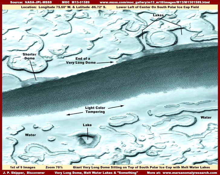 A fentebb bemutatott első felvétel az M13-01589 jelű fotócsík egyik igen különleges területére mutat rá; az elsődleges látnivaló egy igen hosszan elnyúló kupola,jobb oldalt oldalt, nyíllal jelezve. Mielőtt továbblépnénk, fontos tudni, hogy a fent bemutatott felvétel csak egyik oldalát jelenti a fotócsíknak, a helyszín pedig nem más, mint közvetlenül a Déli Sarkvidék jégtakarója, egészen közel magához a Pólushoz, ebből kifolyólag amit láthatunk az jégmező, és nem cserélendő össze a természetes geológiai felszínnel. Azzal is fontos tisztában lenni, hogy a bemutatott fotó igen nagy távolságból készült, minden amit rajta részleteiben láthatunk valójában hatalmas méretű, ellen kell tehát állnunk a szemünk számára berögződött reflexnek, miszerint hajlamosak vagyunk kisebbnek értékelni a dolgokat valós méretüknél. Példának okáért, egy 5-10 emeletes épület túl kicsiny lenne ahhoz, hogy akár csak egyetlen pontként is megjelenjen a képen. A helyszínről elmondhatjuk, hogy olvadékvizet tartalmaz. A kiterjedt jégmező jelentős része, véleményünk szerint, olvadási időszakon halad éppen át, ennek köszönhetően, miként most is, sekély vizű tavak jelennek meg a jégmező egyes pontjain. A sima területek azt is jelzik, hogy ezek az olvadások esetleg nemcsak időszakosan, hanem folyamatosan is jelentkezhetnek. Igen nehéz lehet talán a Kedves Olvasónak elhinnie, de a kerek formák, melyeket a fotón lát, a legtöbb esetben mesterséges eredetűek, a sötét hátak pedig civilizációs nyomok, ezek olykor és szemmel láthatóan kimaradtak a világos színű, a kép egyes részleteit elfedni igyekvő képhamisítási törekvésekből, ezért jelentős hatást keltenek, habár igyekeztek a kép feldolgozói képi érzékelésünket jelentősen összezavarni. A kép közepén teljes egészében keresztülhúzódó sötét sáv első ránézésre talán vízfelületnek tűnhet, amint egy tekintélyes méretű árokban összegyűlt, azonban a sötét színnek köszönhetően sokkal inkább tűnik rendkívül sűrűn beépített civilizációs területnek; pontosan úgy fest, mintha egy zsúfoltan beépített nagyvárosra néznénk alá jelentős magasságból az űrből. Még több hasonló alakzatot be fogunk mutatni.