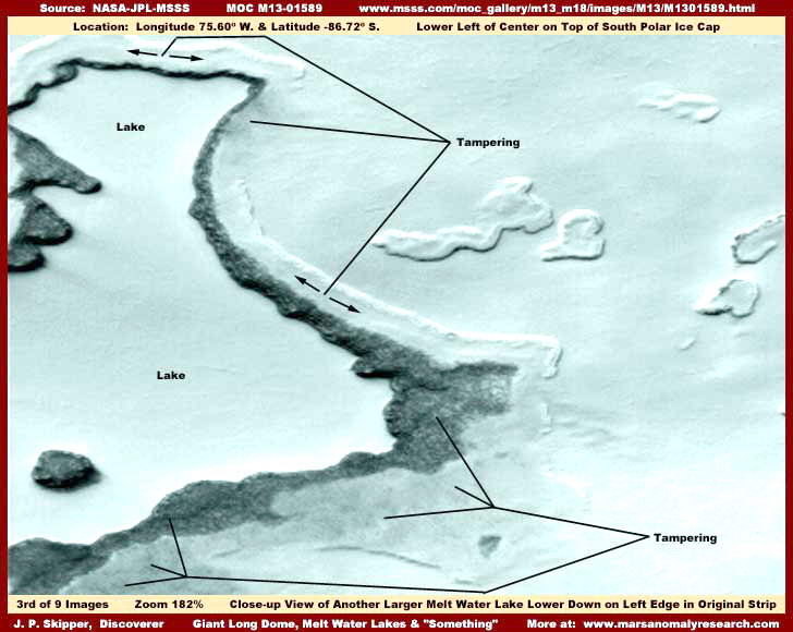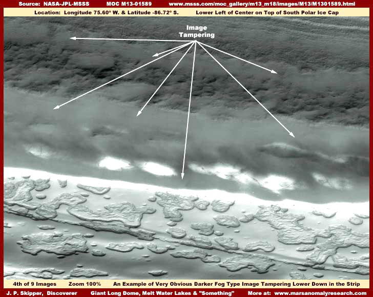 A fenti, harmadik képen tekintélyes méretű tó látható, a fotócsík alsó részéről, annak széléről. Amit erről a tóról el szeretnénk mondani tipikusnak tekinthető a többi „tó” és „partvonal” esetében is, a teljes fotócsíkot tekintve. Ez a lapos terület is rendelkezik a másik két, a kupola mögött elterülő, „tavat” tekintve ugyanazokkal a jellemvonásokkal. Figyeljük meg, hogy a tó felszíne nem tökéletesen egyenletes, kissé hepehupás, ám minden egyes része ugyanazon a szinten található, e tulajdonság pedig a folyadékok jellemzője, mivel természetesen a folyadékok felszíne sima és egyenletes. A tökéletesen egy síkban fekvés arról mesél nekünk, hogy ha az teljes egészében jég, amit láthatunk, akkor alkalmanként olvadási periódusokon kell a területnek átesnie, ez hozza létre a tisztán és egyértelműen látható azonos síkot. Továbbá, ez a lapos terület egyértelműen mélyedést alkot, alacsonyabban fekszik, mint a szélén kiemelkedő vidék, illetve a távolabbra fekvő, ez pedig újabb jellemző vonás, egyben tovább erősíti, hogy ez a lapos terület egyértelműen folyékony anyag karakterisztikáit viseli magán, ha pedig folyadék, akkor elvárásaink szerint csakis víz lehet. Ha valaki áttekinti az állóvizekre vonatkozó bizonyítékokat más beszámolókban, akkor megértheti, igenis léteznek tavak a Marson, sőt, még a Déli Sarkvidék térségében is, egészen a Pólus közvetlen közelségében, ellentétben azzal, amit a hivatalosan kiadott hőmérsékleti adatok alapján várhatnánk. Lehet, mindez szokatlanul hangozhat egyeseknek, de már teljesen mindennaposnak tűnik számunkra. Türelmetlenségre semmi ok, ebben a beszámolóban további ismereteket hozunk nyilvánosságra a felszíni vizekkel kapcsolatban. Miközben azt állítjuk, hogy a lapos területeket víz tölti ki, egyben azt is megjegyezzük, hogy maga a vízfelület egyetlen esetben sem látható, de még jég alakjában sem. Valójában a harmadik felvétel igen kis része valódi csak. A befagyottnak tűnő tófelszín véleményünk szerint nem más, mint igen világos színű, ködös jellegű képhamisítási eljárás eredménye, nagyon finom technikai megoldás során vitték a képre, még a nagyközönség számára szigorúan titkos, eredeti, sokkal közelebbi rálátást biztosító fotócsíkon, és csak eztán adták ki a nagyközönség számára. A tó területén megfigyelhető hepehupás térség annak következménye, hogy a képhamisítási eljárás megpróbálta követni a főbb kontúrjait mindannak, ami a tómederben található, s azt nem sikerült teljes mértékben elfedni. Beláthatjuk hát, e képhamisítási technika alapjaiban nem érinti a felület szinte tökéletes simaságát, a bemélyedés formája is teljességgel szabálytalan, emiatt pedig teljesen jogos az elvárásunk, hogy – a látványból adódóan – víz tölti azt ki. Éppenséggel pontosan ezt is látjuk, dacára a képhamisítási beavatkozásoknak. Hasonlóképpen, a sötét színű partvonal a tavak környékén szintén képhamisítás eredménye, ezúttal sötét színű, fésűzési technika, melynek célja nyilvánvalóan elrejteni azt, ami ott van. Az előtérben- közvetlenül a tóval és a sötét partvonallal szemben, látható egy nagyobb terület, ezen pedig kétségtelenül a ködösítési technika alkalmazását vehetjük észre, valamit itt is igyekeztek elrejteni előlünk. A tó jobb felső részén, közvetlenül a hamisított sötét sáv mellett és a természetes felszín vonala között, ismét csak hamisítási nyomokra bukkanhatunk, ezúttal is a sötétebb ködös, illetve az igen világos, mindent elfedő réteggel. Ugyanezt a sima és igen finom mintázottságú hamis réteget találhatjuk szinte a teljes képrészleten, elfedvén nagyjából mindent, beleértve egyes felszíni formák központi részeit és magasabb pontjait egyaránt. Más szavakkal, majdnem minden hamis az eddig bemutatott felvételeken, nemcsak egyszerűen azzal a céllal, hogy elfedjenek valamit előlünk, hanem még hamis látványt is igyekeznek kelteni arról, mit szeretnének, hogy lássunk. Ez a hamis illúziókeltés a 100%-os felbontáson működik a leghatékonyabban, azon a léptéken, melyet a tudósoknak és a nagyközönségnek kínálnak megtekintésre. Milyen céllal? Valakik nagyon is biztosak abban, hogy a kutatók ezeket a fotócsíkokat csak egy gyors pillantásra méltatják, egyszerűen azért, mert igen nagyszámú felvételt kell áttekinteniük. Ez az egyszerű körülmény máris azzal a következménnyel jár, hogy ha nincs valami nagyon kirívó a felvételen, akkor a szem igen gyorsan átsiklik rajta, pláne, ha a kutató még siet is és nem érzi úgy, hogy valamiért alaposabban is el kellene mélyülnie a fotócsík elemzésében. Mindezt kombináljuk még össze a hivatalos paradigma által okozott vaksággal, emiatt a hivatásos tudósok nyájának nagy többsége azt látja a felvételeken, amit láttatni szeretnének vele, ami természetesen a valóság meghamisított képe, semmi köze az igaz valósághoz. Igen kevesen szánják rá csak magukat a tudóstársadalomban és azon kívül, hogy belenagyítsanak ezekbe a képekbe, s felismerjék, hogy a felszín közel sem olyan ártatlan, ha igen közelről és kritikus szemmel vizsgáljuk. Ha pedig számos felvételt vizsgálunk át ezzel a módszerrel, igen csak komoly csapást mérhetünk a képhamisítókra. Éppen a fentiek miatt gyanakszunk ugyanis a hivatalos oldalakon elhelyezett, függőleges irányítottságú .GIF fotócsíkokon mindössze három közül lehetett választani korábban, ezeket pedig gyakran átfordították. Tudták, hogy a legtöbb kutató különböző akadémiai intézmények kötelékében dolgozik, az egyetemek által finanszírozott szélessávú, nagysebességű Internetet használja, ezért igen gyorsan 