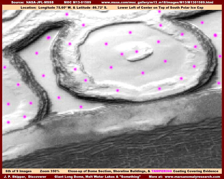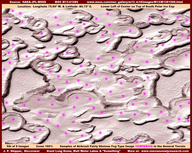 A fenti, ötödik felvételt azért helyeztük el itt, hogy széles rátekintést adjunk a Déli Sarkvidék térségének jégmezőiről, és arról a látványról, mely legtöbb esetben fogad bennünket ha a Mars e területéről készült fotócsíkokat kezdjük vizsgálni. További cél a felvétel elhelyezésére az volt, hogy kellő segítséget nyújtsunk a legáltalánosabban használt képhamisítási technika felismerésében; minden ilyen helyet ibolyaszín pontokkal jelöltünk. Miközben természetesen a pontok bosszantóak és zavarólag hatnak a látványra, egyben azt is demonstrálják, milyen hihetetlen mértékben és arányban hamisították meg csupán ezt az egyetlen felvételt. Ami még rosszabb, nem csak ezt az egyetlen technikát alkalmazzák ilyen célból, még jelen esetben sem. Továbbá, ez a széleskörűen alkalmazott pamacsolási technika a hamis illúziókeltésről szól, amikor a szemünk elé táruló látvány valami egészen más, mint a valóság. A helyzet az, hogy majdnem a teljes képmező hamis, a formák, melyeket látunk, megtévesztőek, a valódi felszín látványában kissé eltér attól, amire most tekintünk. A kissé kiemelkedő felszíni formák valójában magasabbak és szélesebbek annál, miként itt megjelennek a sötét szalagforma képében, s területük zsúfolva van civilizációs nyomokkal. A milyen fekvő, tökéletesen sima felszínű bemélyedések létező formák, ám valószínűleg a jégmezőkből kiolvadó víz tölti ki őket, de ez a felszín meghamisított, a nagyközönség számára pedig csak ezt adják ki, és ezt is szántszándékkal elrontott felbontáson. A finom, hamis mintázatot a nagyfelbontású eredeti képen hozták létre, a beavatkozás eredményeként a tavakban lévő kiemelkedések/struktúrák nyomai megmaradtak; e beavatkozások nyomán jött létre a megfigyelhető mintázat. Arra gyanakszunk, a következő hamisítási technikát már nem a legnagyobb felbontáson vetették be, ezek már a körvonalait is elrejtik a nagyobb struktúráknak, melyek még a finom alkalmazások után kivehetők maradtak. Amikor hozzáadták a nagy távolságról készült fotó benyomását keltő hatást, mely egy igen hatékony megoldás, és rendkívül nehéz beazonosítani, ennek következtében a nagyfelbontáson végrehajtott beavatkozások rendkívül nehezen felismerhetőek, és beleolvadnak más hamisítási alkalmazásokba, s a felbontás lerontásával mindez teljesen összefolyik. Így működik tehát a rendszer. A sötét sávok félig áttetsző sötét tintaréteg felhordásának eredménye, olykor igen vastagon viszik rá a felvételekre, így rejtenek el mindent, ami csak ott volt, más esetekben ezt az áttetsző megoldást használják, így emelnek ki egyes területeket. A hamis illúziókeltés érdekében bevetett technikáknak nem az elsődleges célja, hogy elrejtsenek valamit, éppen ellenkezőleg, azt a látványt igyekeznek sulykolni, mintha befagyott tavakat látnánk, eközben persze elterelni arról a figyelmet, hogy bármiféle civilizációs nyom is lenne a helyszínen. Miként azt már ismételten beszámoltunk, szándékaik szerint, azt szeretnék, ha a kutatók „felfedeznék”, az MGS MOC kamerái felvételeinek elemzése révén, hogy a Marson víz van, amit ők már régóta tudnak, de legalábbis a Viking űrszondák adatainak feldolgozásából, melyeket szintén súlyosan hamisítottak. Emlékezzünk rá, ez a döntés már évtizedekkel ezelőtt, sokkal korábban, mint hogy az MGS küldetés egyáltalán elkezdődött. Azonban, ahogy elkezdték a MOC adatait nyilvánosságra hozni, és a tudósoknak csak nem akaródzott megtalálni a felszíni víznyomokat a Marson a saját erejükből, folytatták a korábban megkezdett módszerüket, haladtak az áramlattal, hogy időt nyerjenek. Arra gondolunk, felvettek egy „várj és nézgelődj” álláspontot, elfogadván azoknak az írásoknak a megjelenését is, melyeket ezen a honlapon is látni. Ha a nyilvánosság megérti ezen beszámolók lényegét és tömegesen elkezd felébredni a Marssal kapcsolatos igazságot illetően, biztosak lehetünk benne, vissza fognak térni eredeti terveikhez. Ha azonban a nyilvánosság elveti ezeket az anyagokat, mint „egy szerencsétlen becsapott együgyű vad álmait”, valamiféle zavaros honlapon, ismét csak menni fognak tovább a sodrással, hogy időt nyerjenek. Tudják, az igazság végül úgyis kiderül, egyetlen kérdés lehet csak a számukra, az, hogy mikor. Ha később, az az ő malmukra hajtja a vizet, annak ellenére, hogy a nagyközönség szundikálása és nemtörődömsége egyáltalán nem jó dolog. Úgy gondoljuk, nagyon jól ismerik a társadalom viselkedését (az évtizedek óta zajló manipulálásának ténye önmagáért beszél) és úgy hiszik, a széles nyilvánosság igazából semmit nem akar tudni erről az ügyről (eltekintve számos, de mégiscsak elenyésző kisebbséget jelentő tagjától), és a színjáték elégedettséggel tölti el őket. Minden csak a megértés és az időzítés kérdése.