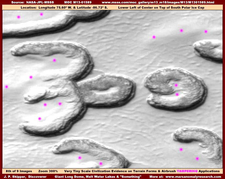 Nem tehetünk róla, feltétlen be kellett ide illeszteni a fenti, nyolcadik, 300%-os nagyítású felvételt. Meglehetősen izgalmas, nem igaz? Itt van mindjárt ez a gigászi szám, „309”, amint visszanéz ránk. Nyilván nem mondhatjuk, hogy ez a szám mesterséges alkotás lenne, vagy a természet játéka, a véletlenszerű geológiai folyamatok alakulása következtében. Amit elszeretnénk mondani az az, hogy az itt látható felszíni formák tömve vannak civilizációs nyomokkal, miként majdnem az összes forma ezen a fotócsíkon. Nem jelentkezik minden annyira látványosan itt, a fenti felvételen, ám sokkal jobban kivehető a következő, 500%-os nagyítás mellett. Mindezek ellenére, ha valaki nagyon közel hajol a képernyőhöz és igen körültekintően vizsgálja a felvételt, megláthatja, a sötét részeken továbbra is függőleges, szögletes formák emelkednek, elfoglalván a sötét területek túlnyomó részét. Az ibolya színű pontok ismét csak a pamacsolásos képhamisítási technika alkalmazását jeleztük, ez a végső beavatkozás, egyes helyeken vastag, más helyeken vékonyabb, azonban minden esetben elegendőek a helyszínen található dolgok elrejtéséhez. Akárhogy is, a legfőbb ok az itt felsorakoztatott képek bemutatására annak felvázolása, hogy bizony alaposan meg kell vizsgálni a látszatra teljesen ártalmatlan részleteket is, mint például a vonalas mintázatot a bemélyedésekben összegyűlt tavak területén. Azt is figyeljük meg, hogy a pamacsolási technikák ezen mintázatok egyes helyein is alkalmazásra kerültek. Nincs minderre kézzelfogható bizonyítékunk, azonban gyanakszunk arra, hogy ezek a mintázatok nem durva jégfelszínt képviselnek, miként az elsőre látszik, hanem egy nagyon finom, nagy felbontáson alkalmazott képhamisítási technika eredményei, ez kelti a megfigyelhető vonalas mintázatot, viszont lemaradt a hamis fedőréteg, miként arról szó van egy másik beszámolóban, „Civilizáció a sarki jégmezőn” – címmel, ahol valamivel jobb, bár továbbra is távoli rálátást kaphatunk ezekre a mintázatokra. Amit itt felvonultattunk azzal azt szerettük volna bemutatni, hogy majdnem minden, amit a fotón látunk, képhamisítás áldozatává vált. Mindenkinek meg kell tanulnia felismerni ezeket a hamisítási technikákat, aki mélyebben el szeretni merülni a marsi fotók elemzésében, ugyanis ezen ismeretek nélkül lehetetlen megérteni, mi is folyik ott tulajdonképpen, megismerni azokat a civilizációkat, melyek benépesítik a bolygót.