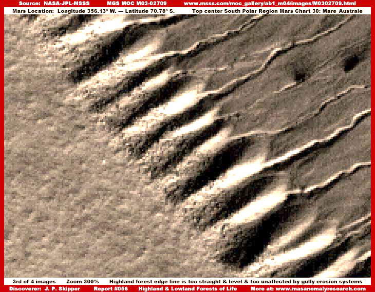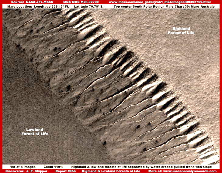 A fenti, első felvételen egy kiterjedt mélyföld szélét láthatjuk, a mélyföld maga balra lefelé folytatódik, a jobb felső részen pedig egy táblás jellegű felföldbe megy át. Hosszú meredély-rendszert láthatunk, lejtős vidék köti össze a felföldet a mélyfölddel, mély bevágódások hagytak nyomot ezen az átmeneti területen, jobbról-balra lefelé irányítottan. Miként jól látható, ezen a bizonyos átmeneti területen, mély bevágódások találhatók, ezeket pedig egyértelműen folyékony víz hozta létre, az áramló víz eróziós hatása vágta ezeket a mély barázdákat, amint a felföldről alázúdult a mélyföldre. Ehhez kétség sem férhet. Miként látható, a felföld szélén, világos színű, nagy fényvisszaverő-képességű alakzatokat találhatunk, ezek erodált meredélyfalak. Geológiai értelemben feltételezhetjük, hogy ezek az erodált meredélyfalak egyben azt is jelzik, egykor meddig terjedt a felföld határa, ettől a határvonaltól kezdett lekopni, egyértelműen a folyékony víz hatása által, hátrahagyva maga után az egyre mélyülő bevágódásokat, viszont a meredélyfal kellően szilárd lehetett ahhoz, vagy pedig nem állt még elegendő idő rendelkezésre, hogy ezek az erősen megkopott részek leszakadjanak a mélyföld felé. Végül eljutottunk oda, ami ennek a beszámolónak az elsődleges célja, a sűrű erdei élet takarójának bizonyítékához, mely mind a mélyföldi, mind a felföldi területeket befedi. Jó ideig nem hozta ezeket a felvételeket Skipper nyilvánosságra, szeretett volna mélyebben a színfalak mögé látni e témában. Mind a felföldön, mind a mélyföldön elburjánzó sűrű takaró tulajdonképpen csak egy reprezentatív mintának tekinthető, hiszen ugyanezt a formációt figyelhetjük meg a fotócsík teljes hosszában, a fotócsík környezetében, és más szomszédos fotócsíkokon is. Alapjaiban ugyanolyannak látszanak, tehát nincs is értelme erről bővebben értekezni. Ha valaki nagyon közelről megnézi a fenti első felvételt, hogy ami egységes, sűrű textúrának tűnik, felszakadozik és egyedi elemek vehetők ki a meredély szélén látható, vízerózió által kimart sziklák tetején és közöttük. A helyzet hasonló a mélyföld és a meredély szélén, ott is jól beazonosíthatók egyedek, amint a meredély falában megtelepedni igyekeznek. Sőt, elszórtan az egész eróziós térségben láthatunk belőlük. Ez pedig jelentős felismerés, ahogy a felföldön az erdőtakarót alkotó faj egyes példányai igyekeznek megszállni a meredély oldalfalát és minden lehetséges helyszínt, igen jellemző. Nyilvánvaló, erre a szárazabb időszakokban több esélyük kínálkozik, a nedves időszakokban a vízfolyás egész egyszerűen elmoshatja őket és csak a kiemelkedőbb helyeken vethetnek tartósan lábat.