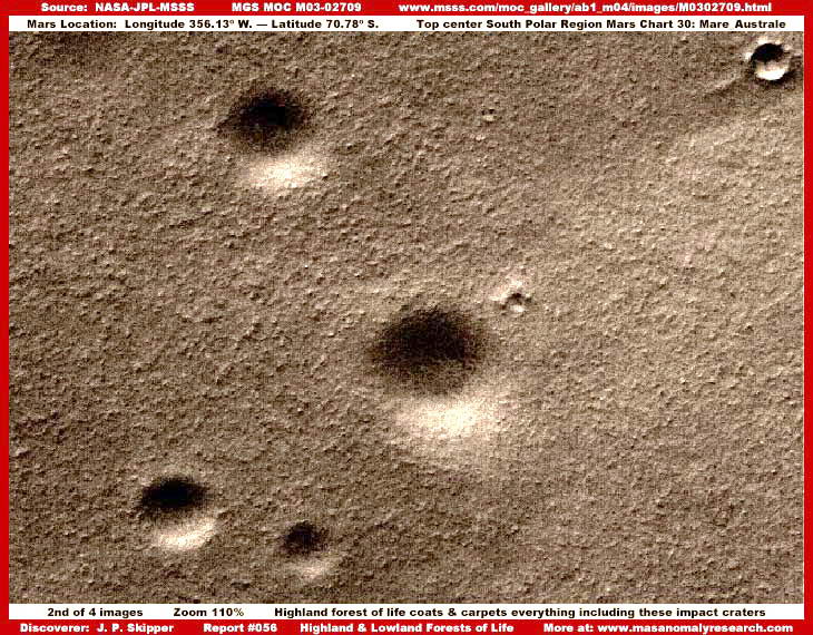 A fenti, második felvétel további részleteket mutat be ebből az egységes textúrából és kölcsönhatásából a szárazföldi formákkal. Ez esetben a felföldről láthatunk részletet, azért illesztettük be éppen ezt a részletet, mert jól mutatja, mit történik ha hat különböző méretű kráterrel kerül kapcsolatba. Figyeljük meg azt a takarót, mely sűrűn befed mindent, körbeöleli, kitölti és elrejti a négy nagyobb krátert, kerek formájuk jól látható, ám mint tudjuk, a kráterek normális esetben éles körvonalakkal és belső területtel rendelkeznek, sima textúráltság mellett. Az itt megfigyelhető takaró azonban szőnyegként borul a felszínre, teljes egészében elfedi a valós geológiai alakzatokat, semmiféle felszíni részlet nem látható, legfeljebb a kiterjedtebb objektumok körvonala; a szóban forgó takaró pedig megjelenése alapján igen sűrű, növényzetből álló erdőségnek felel meg, méghozzá fejlődésének igen agresszíven terjedő szakaszában; ezeket a jellemvonásokat mutatja nagy távolságból, ahol már az egyedi alkotók nem vehetők ki, hiszen egy egymásba gabalyodott rendszert láthatunk, egységes mintázatot alkotva. Sir Arthur C. Clark nem sokkal halála előtt adott hangot meggyőződésének, miszerint a Marson növényzet található, és az ilyesfajta közlés pszichológiai tartalma, amit egy olyan jól ismert ember ad, mint ő, a marsi szokatlan jelenségek kutatásának megkezdése felé kellene hogy terelje a médiát. Valóban van növényzet a Marson és nem is kevés. Miként sokan tudják, e növényzetnek legnyilvánvalóbb megjelenési formáit már számos beszámolóban bemutattuk, a legnagyobb példányait kiemelt részletességgel, hiszen éppen ezek árulják el önmagukról a legtöbb részletet és találhatók meg legkönnyebben a gyenge minőségű műholdas felvételeken. Azonban Sir Arthur személyesen még hozzátette mindehhez John Skippernek, hogy nem hisz a felvételek meghamisításában, és abban sem, hogy ha ilyesmi tényleg létezne, azt hosszú időn át titokban lehetne tartami. Úgy gondoljuk, hogy általánosságban elmondható, aki ilyesmiről hall, meglehetősen hitetlenkedve fordul a kijelentéshez, hiszen meglehetősen kicsi annak az esélye, hogy egy ilyen mérvű megállapítás hihetőnek tűnjön első hallásra, ráadásul, igen sok a zavaró körülmény. Sir Arthurnak emellett már igen hosszú ideje van kapcsolata magas hivatalos körökkel a hagyományos bolygókutatási programok kapcsán, nyilván valamennyi érintettségének is lennie kell ebben a témában, bizonnyal megbízik kapcsolatai kijelentésében, e kérdésben pedig kifejezetten konzervatív hozzáállású. Megjegyzendő, ez a kifejezetten konzervatív hozzáállás jellemző publikálási tevékenysége során is. Nos kedves Sir Arthur, mindenekelőtt a valóságot kell követnünk, arra mennünk amerre vezet, és megpróbálni nem szemben járni vele – ez a személyes tapasztalatunk. Valójában, amikor nekiláttunk ennek a bizonyos beszámolónak az elkészítéséhez és mélyebben belemerültünk a felvételek elemzésébe, csalódottságot éreztünk, mivel egyre nyilvánvalóbbá vált, hogy amit „erdei” növényzetnek véltünk, az bizony más, eltérő irányban kezdtünk el kutatni, olyan irányban, melyet különösebben nem szeretünk újra és újra felemlegetni. Az igazság az, hogy a közelebbi vizsgálatok alapján nagy bizonyossággal kijelenthetjük, igazából kiterjedt és rendkívül hangsúlyos képhamisítási eljárásba ütköztünk ismét, ez okolható a hamis látvány kialakításáért. A hamis illúzió-keltésnek természetesen nem az volt a fő célja, hogy valamiféle sűrű erdőséget varázsoljanak elénk, sokkal inkább a figyelem elterelése, mindenfajta viták beelőzése az adott helyszínen található alakzatok miatt, ezért az egész területet hamis fedőréteggel fedték be, tökéletesen megfosztva a nyilvánosságot a valós látványtól. Az erdőség képe, ám olyan minőségű képe, ahol semmiféle részlet nem kivehető ebből a távolságból tehát csak a figyelemelterelés szolgálja, ne gondoljon senki arra, mi van itt ténylegesen, de nem is teheti ezt, hiszen tökéletes a lefedés.