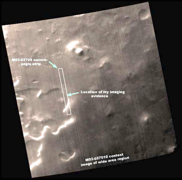 Továbbá, az első három felvételen, a keskeny látószögű M08-06569 fotócsíkról származó részletek csak kicsiny töredékét képezik egy sokkal kiterjedtebb felhőrendszernek, ennek teljes nagyságát a fenti, M08-06570 nagylátószögű, kontext felvételen láthatjuk; az előbb említett fotócsík megjelölve. A számos, világos színű fehér folt kétségtelenül nagyméretű felhők, a felemelkedő pára kicsapódása hozta őket létre miután a magasabb légkörben lehűlt, ebből a csoportosulásból látunk néhány kisebbet, áttetszőbbet az M08-06569 jelű fotócsíkon. Az igazsághoz hozzátartozik, hogy a szinte átlátszatlan fekete foltok minden bizonnyal képhamisítási eljárás részei, valamit ismét nagyon igyekeztek elrejteni szemünk elöl, talán az alant levő felszínen. Nem szabad tehát összekeverni a dolgokat és szem előtt kell tartani, hogy nem minden hihető el valóságosnak még ezen a széles látószögű felvételen sem. A legfontosabb dolog tehát az, hogy a keskeny látószögű felvételen megjelenő felhőzet csupán egy igen kiterjedt felhőrendszer kicsiny részét képezi, a teljes felhőrendszer hatalmas területre terjed ki, ez a terület pedig még a nagylátószögű felvétel által átfogottnál is akár sokkal nagyobb lehet. A jelenség kiterjedtsége pedig utal annak eredetére is, nem lehet holmi elhanyagolható és véletlenszerű légköri jelenségről szó. Ha valaki alapos figyelmet szentel a kislátószögű felvételnek és előre-hátra zúmol benne, változtatja a kontrasztot, hogy a felszíni részleteket jobban szemügyre vehesse, megtapasztalhatja, hogy a közvetlenül a felhőréteg alatt fekvő terület teljes egészében le van fedve valamivel, amilyen réteget itt, az ötödik felvételen láthatunk. szinte alig, vagy semmi felszíni részlet vehető ki csupán, emiatt a mindent elfedő „valami” miatt. Első ránézésre azt gondoltuk, talán valamiféle növényzetre tekinthetünk alá nagy távolságból. Nézzük meg közelről, és jól láthatjuk, hogy a felszínt sűrűn benépesítik a közvetlen egymás mellett lévő egyedi objektumok; igaz, szinte pontosan a felbontás határán vagyunk, ezért nem tudunk közelebbi vizsgálatot megejteni, mik lehetnek ezek a tömegesen előforduló objektumok. Azonban felismertük, lényegében nem számít mennyire nagyítunk bele a felvételbe, vagy vesszük azt élesebbre, az egyetlen dolog, ami változik, azok az egyedi pixelek. A tény az, hogy nem számít mennyire látszik valóságosnak ez a felszín, valójában már pixel szintjén beavatkozás történt, offset pixel-átfedési technikát alkalmaztak, ennek következtében pedig megváltozott az eredeti felszín látványa, akármi is volt ott. E módon próbálták becsapni ítélőképességünket. Tapasztalatunk szerint, ha képhamisításba bukkanunk, akkor mindig civilizációs nyomot sejthetünk. Vagyis, amennyiben bármiféle civilizációs nyom felbukkan egy adott területen, mindjárt rá is nyomnak valamiféle fedőréteget, ahol tehát fedőréteg található, ott bizony határozottan valamilyen „élet” nyomai is. Továbbá, a kép file-méretét kisebbre vettük, hogy könnyebben letölthető legyen az Internet segítségével, az eredeti méretet 2.5-szeresére csökkentettük, eközben semmiféle minőségromlást nem tapasztaltunk, tehát semmiféle olyan információt nem tartalmazott a kép, ami elveszett volna belőle. Igaz, nem sokat segít, de elmondjuk, hogy míg ha ránézünk a képre sziklásnak tűnő mintázatot látunk a felszínen, a PhotoShop program sűrűn egymás mellett elhelyezkedő, tekintélyes méretű, egyedi objektumokat érzékel, méghozzá igen nagy számban. Mivel a Mars természetes felszínét ábrázoló fotók ezreit vizsgáltuk át, méghozzá nem ekkora távolságból, és lerontott felbontás mellett, elmondhatjuk, hogy az itt megfigyelhető jelenség egyfajta indikátor, teljesen jogos a gyanúnk, hogy épületeket igyekeztek elrejteni előlünk, nagy számú épületet; könnyű észrevenni a szándékot ha a felhők alatt keresünk felszíni részletek után.