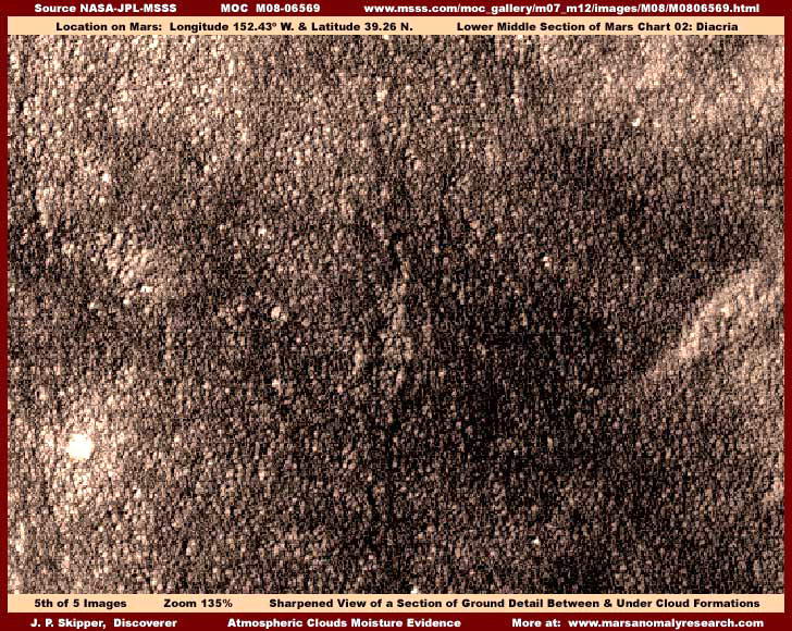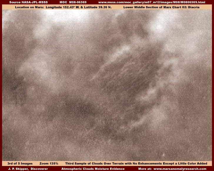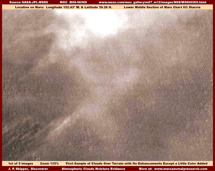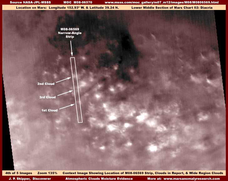 Számos esetben történt meg, hogy gondoltuk, felhőket fedeztünk fel a Marson. Sajnos, a legtöbb esetben felszíni jelenségek is csatlakoztak hozzájuk, mint pl. pára, köd, felszíni felhők, füst, stb., a talajközeli felhők pedig könnyen összekeverhetők a részleteiben jellegtelen képhamisítási beavatkozásokkal, emiatt igen nehéz volt biztos álláspontot elfoglalni, beszámolót írni. Jelen írásban azonban a dolog valóságosságához kérdés sem férhet, magaslégköri felhőket látunk az M08-06569 jelű fotócsíkon, ezek pedig nem kapcsolódnak és nem is keverhetők össze semmiféle felszíni, vagy felszínhez közeli alakzattal. Ha ezeket a felhőképeket valaki már bemutatta volna, bizonyára elkerülte figyelmünket, ez esetben természetesen az adott illető a felfedező és nem John Skipper. De ebben az esetben is igen fontos, hogy a felvétel tisztaságára vessünk néhány pillantást.