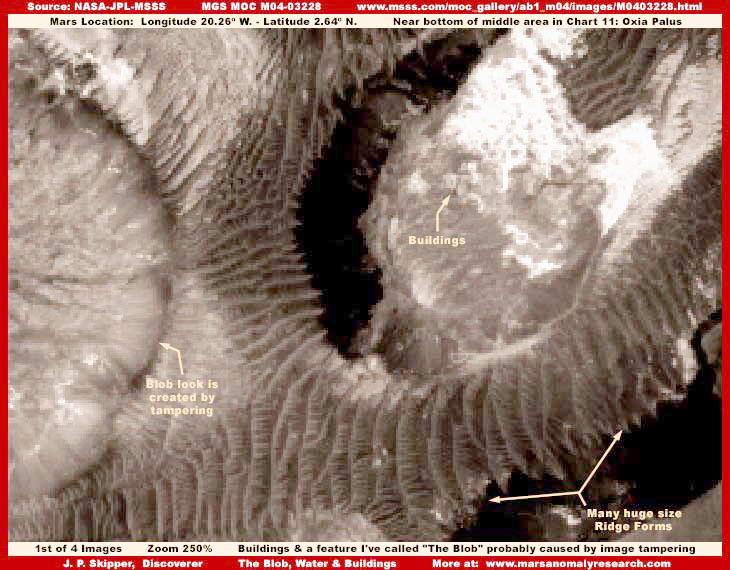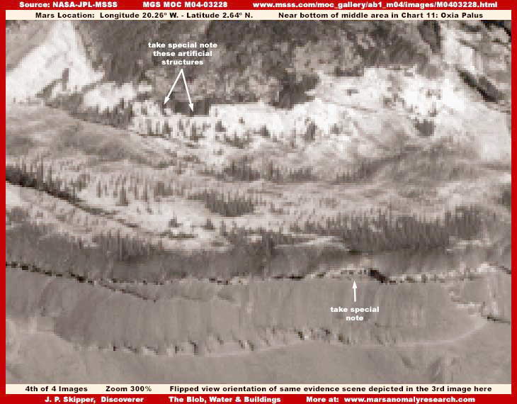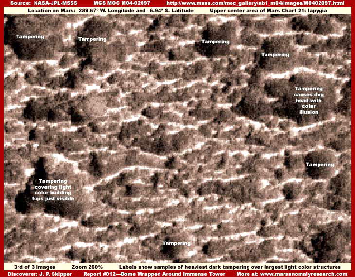 A fenti, harmadik felvétel bemutat néhány példát a nyilvánvaló képhamisítási beavatkozásokra, ezúttal 260%-os nagyításon. A bal alsó sarokban látható egy, közvetlen objektum-specifikált képhamisítási eljárás sötét pacája, feliratozott címkével. Ezt a megoldást jelen esetben nagyon magas és fényes struktúrák csoportjára alkalmazták, tetejük viszont átüt a képhamisítási alkalmazáson, fölötte látható. Habár a helyszín igen szemcsés és elmosódott, a nagyon közeli vizsgálat mindezt láthatóvá teszi. A jobb felső sarokhoz közel a képhamisítási alkalmazás még nagyobb pacáját láthatjuk, szintén megcímkézve. Ha hirtelen ránézünk, olybá fest, mintha egy nyitott szájú kutyafejet látnánk, sötét bal szemével, és a világos színű felszínből kimeredő nyakkal. Természetesen mindez csak a képhamisítás által keltett illúzió, nagyobb méretű, világos színű struktúrák láncolatát rejti el. Azonban az is lehetséges, hogy a képhamisítási alkalmazás körvonalaiban követ egy állatfejet formáló, hatalmas méretű műalkotást. A két jelzett, sötét pacával lefedett felszíni terület között kisebb geometriai szerkezetek helyezkednek el nagy számban. Többségük nem látható a jelentősen lerontott felbontás miatt és a közvetlen specifikusan alkalmazott képhamisítási technika miatt, azonban néhány esetben mégis megjelennek főbb geometriai formáik és mintázatuk. Nagyon közeli vizsgálat felderít néhány sötét, magas, szögletes formát; ezek minden bizonnyal épületek, és nem teljes mértékben estek a képhamisítás áldozatául. Ezek az alakzatok tipikusnak mondhatók a fotócsík teljes területén, ebből is látható, mi is található valóban ezen a síkságon a hatalmas torony és kupola térségében. Nos, üldögélvén a nagy kiterjedésű, természetes geológiai eredetű síkságon valahol nagy távolságra a hatalmas torony és kupola komplexumától, mely objektum akár mennyire is uralkodó méretében a környéken, mégis, a teljes térség civilizációs alkotásokkal sűrűn telezsúfolt, erre utal a képhamisítási eljárások fokozott és együttes alkalmazása. Így működik tehát a marsi műholdas képalkotás. A képhamisítási technikáknak számos típusa van, ezeket kiterjedten alkalmazzák, többnyire sikeresen, ám vannak esetek, amikor szerencsések vagyunk és kicsiny bepillantást nyerhetünk mit akar éppen elrejteni előlünk a számítógépes program. Erről a fotócsíkról már 2000-ben is készült beszámoló, s már akkor megemlített Skipper néhány lehetséges, tekintélyes méretű műtárgyat. Miközben egyre szaporodott tapasztalata a marsi műholdas fényképezés kapcsán, gyakran visszatér már elemzett dolgokhoz. A fotó mintázata segített számunkra annak eldöntésében, hogy az akkori felvetései izgalmasak, ám eléggé marginálisak, nehezen érthetőek amíg nincs valaki tisztában jelen felvétel pontos méretarányainak érzékelésében. Ennél a pontnál, habár minden valószínűség szerint valóban mesterséges alkotásokkal van dolgunk, azt mondhatjuk, hogy az ott megfigyelhető mintázat alapján nem vonhatunk le semmilyen bővebb következtetést, ezért nem is frissítette az említett írást.
