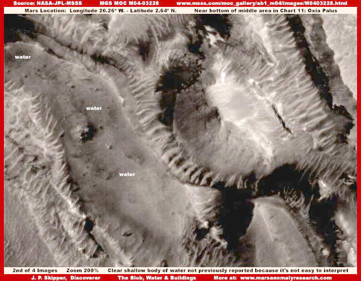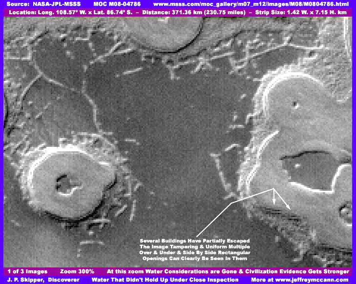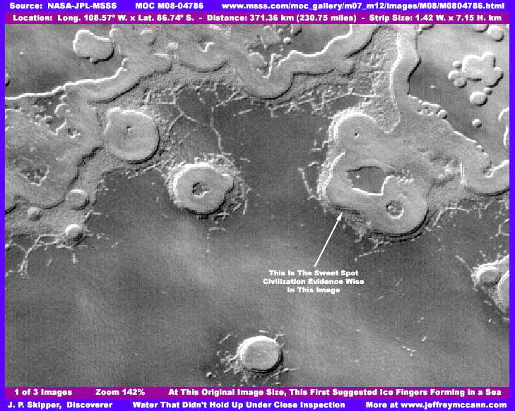 Amikor először megláttuk ezt a fotócsíkot, először arra gondoltunk, talán a jégmezőben kialakult „ujjakra” tekintünk alá, a jeges olvadék-iszap természeti hatásának eredményeként. Ám nem szabad megfeledkeznünk arról, hogy a hivatalos tudományos adatok szerint a Mars Déli Pólusának térségében a rendkívül szélsőséges, -120 Celsius fokos hőmérséklet uralkodik. Azaz FOLYÉKONY vízből kialakul tavak látványa elméletileg teljességgel lehetetlen. Nos, Skipper már éppen elegendő folyékony állapotú vizet fedezett fel ebben a térségben, hogy minden alapja meglegyen a hivatalos álláspont megkérdőjelezéséhez; tény, hogy valóban hideg van, ám a hivatalos adatok kiértékelési eredménye távol esik a valóságtól. A másik ok, ami miatt a sötét, túlnyomórész semmiféle részletet nem tartalmazó területet könnyű vízfelületnek nézni, az ugyanis ráadásul még szinte tökéletesen sík is, miként azt az első felvételen jól láthatjuk. Ráadásul (itt nem látható módon) még sokkal nagyobb területre is kiterjed, messze az itt bemutatott képrészlet határain túl. A hivatalosan kiadott felvételen, ilyen tekintélyes távolságból, számos, jól látható jellemvonás utal folyadék jelenlétére, mint pl. a tökéletesen sima felület, a sötét szín, a becsapódásos kráterek alapvető hiánya, és a „sziget” formák megjelenése. Azonban, az alapos vizsgálat feltárja, hogy lényegében hatalmas kiterjedésű civilizációs nyomokról van szó, éppen a felbontás határán.
