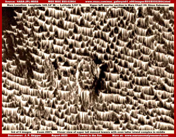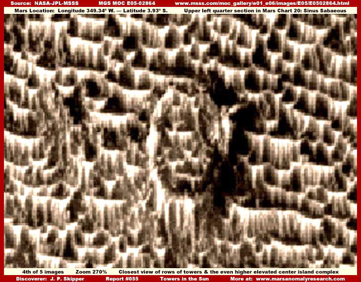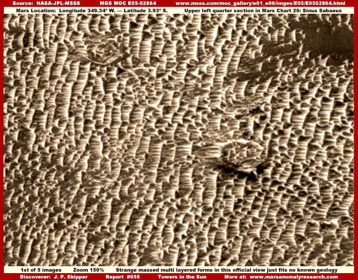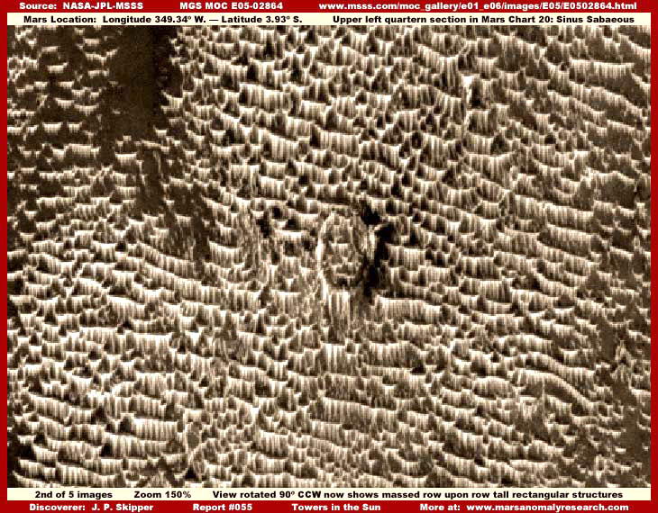Jelen beszámolóban szereplő felvétel az MGS MOC E05-02864 jelű képi tudományos adatból való. A fenti első képen nem természetes geológiai felszínt látunk, semmilyen vonatkozásban. Amit látunk, az egységes, a természetes felszínt tökéletesen befedő, azt teljes mértékben elrejtő, tömegesen felbukkanó formák. Figyeljük meg, milyen, színükben határozottan elkülönülő sávokat láthatunk, olyan benyomást keltve, mintha cserepekkel lenne kirakva a táj. Olybá festenek, mintha színes cserepeket rakosgatott volna valaki egymás tetejére, sorokban és kötésben, aztán az egészet átfordította volna a másik oldalára. Egy dolog biztos, nem úgy néznek ki, mintha tornyok lennének a Marson, amelyek valójában. Amikor a szóban forgó helyszínt a hivatalosan kiadott irányultságában nagyítjuk, továbbra sem találunk semmi említésre méltót. Mindez azért, mert már hivatalos szinten rendkívüli mértékben összekavarták a látványt. Az alábbiakban részletesen kifejtjük ezt a történetet. Skipper elsőként az M03-06971 jelű felvételen figyelt fel ezekre az alakzatokra még a 2000. év közepe táján, nem sokkal azt követően, hogy az MGS MOC adatait elkezdték nyilvánosságra hozni. Egy ideig visszatartotta a felvételt, mert vízkitöréseket sikerült felfedeznie rajta. Akkoriban még kevés tapasztalattal rendelkezett, és elfogadta azt az alaptételt, amit mindenki más is, a Marsra vonatkozó hivatalos propagandát, és nem rendelkezett kellő tapasztalattal sem a képhamisítási technikák alkalmazása terén, úgy hitte, a természetes geológiai eredetre vonatkozó magyarázatok elfogadhatónak tekinthetők, jelen esetben például lávafolyásoknak értelmezve a megfigyelhető alakzatokat. Azonban a vízszintesen egymásra rakosgatott csempék túl szabályosaknak tűnnek, miként a sorok és a mintázat is igencsak egységes benyomást kelt; bármiféle geológiai eredetre vonatkozó magyarázat fennakad a további mélyebb elemzés hálóján. Skipper tehát félretette felfedezését, hagyta, hagy dolgozzon az agyában, miközben várakozott, hasonló nyomokat tartalmazó fotócsíkokra, melyek talán segítenek tisztázni ezt a különös jelenséget. Ahogy a kutatási évek teltek mögötte, néhány dolog kezdett körvonalazódni. Először is, ez a bizonyos jelenség a Mars igen nagy területeire kiterjedően hálózza be annak felszínét, a legsűrűbben a 0 fokos északi és déli szélességnél, és 0 fokos nyugati hosszúsági körök metszéspontjánál; az E05-02864 és az M03-06971 katalógusszámú felvételek a megjelölt középponttól pontosan délkeletre esnek. Más szavakkal, a Mars térkép hivatalosan megállapított földrajzi hálózatának tökéletes középpontjában. Mielőtt még szó érné a ház elejét, fontos megjegyezni, az ilyen típusú alakzatok nagy részét a legkülönbözőbb típusú képhamisítási technikák alkalmazásával igyekszenek előlünk elrejteni, legtöbb esetben csak símán lefedni, hogy hamis és megtévesztő látványt keltsenek. A képhamisítási alkalmazások tehát bőségesen jelen vannak és sokfélék, azonban nagyszámú felvétel átnézése erről a kiterjedt térségről azonos vagy igen hasonló (a látószög függvényében) típusú civilizációs nyomokat fed fel, ahogy a felbontás határán még éppen kimeredeznek a képhamisítási technika során felvitt fedőréteg elól, számos helyen. A legtöbbjüket még objektum-specifikus technikával is igyekeztek eltüntetni, miközben egyébként is igen apróknak látszanak a felbontás szándékos lerontása, azaz a távolsággal való manipuláció miatt. Ahogy Skipper tapasztalatai gazdagodtak, kezdte megérteni a látványt, amit a fenti E05-02864 jelű fotócsík mutat, illetve az általa elsőként felfedezett M03-06971 jelű, ugyanis elsősorban a látószög volt az, ami jelentősen összezavarta az alakzatok megjelenését, és adta ezt a vízszintesen egymásra rakosgatott csempesorok látványát. Az is kezdett nyilvánvalóvá válni, hogy a felvétel ilyetén tájolása szándékos manipulációra vall, újabb technika a képhamisítási eljárások között. A számukra az okozott problémát, hogy a terület, melyen ez a fajta alakzat-típus látszik igen nagy, ezért számos fotón megtalálható. Hasonlóan, különleges figyelmet szenteltek a szokatlan formák miatt neki a hivatalos körök, ez a hozzáállás ugyancsak igen nagyszámú fotót eredményezett. Ekkora mennyiségű fotó számos átfedést okozott a különböző képhamisítási technikák alkalmazásában, egyértelműen láttatva azt, hogy olykor ugyanazt a területet más alkalmazás bevonásával igyekeztek meghamisítani, márpedig már maga ez a vonás meglehetősen gyanús ahhoz, hogy felkeltse a figyelmet, hiszen más-más módszerekkel igyekeztek elérni a szemlélő figyelmének elterelését, miszerint itt nincs is semmi látnivaló. Ennek megfelelően, a számítógépes programjuk kifelejthetett egy vagy két felvételt, nem sikerült róluk teljes mértékben eltörölni a nyomokat, annak eredményeként, hogy a hamisítási eljárásokat sokkal kiterjedtebben kellett alkalmazni, a megszokottnál jóval nagyobb területre, s eközben bizony a programnak nehézségei adódhattak. Mindezeket figyelembe véve Skipper úgy érezte, olyan felvételre van szüksége, mely mélyebb nagyítást tesz lehetővé, azért, hogy az alakzatok részleteinek pontosabb megismerése azok rendeltetésének valódi megértéséhez vesessenek közelebb. Nem sokkal azután fedezte fel az itt mellékelt E05-028864 fotócsíkot miután nyilvánosságra hozták, s egyben tökéletesen megfelelt a kijelölt célnak. Habár nem kecsegtetett sikerrel, mégis halasztotta ennek a beszámolónak a megjelentetését, részletdúsabb felvételre várva. Várakozása azonban nem hozott sikert, tehát nem volt értelme tovább foly