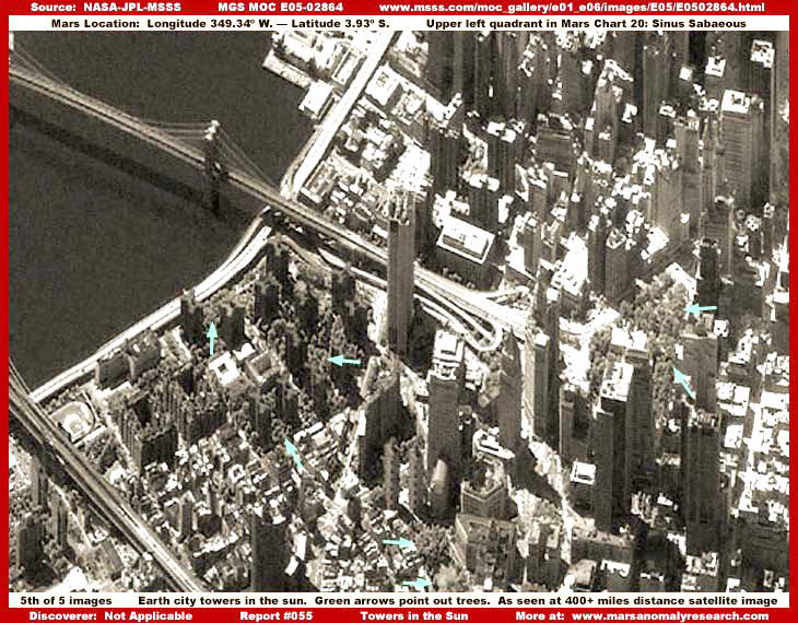 Nos azért, hogy kicsit megingassuk a hatalom szavában maximálisan megbízók hitét, azokban, akik a marsi ismereteket „tálalják” számunkra, ide illesztettük a sorban az ötödik felvételt. Közönséges műholdas felvételt látunk egy nagyobb földi városról (nem olyasmi, ami mostanában a Marson látható), azonban jellemzően mutatja egy metropolisz „tornyait” a napfényben. Figyeljük meg, milyen sűrűn helyezkednek el, és miként alkotnak csoportokat a legmagasabb épületek a Földről készült képen. Ezt a mintázatot a felszíni közlekedés és a gazdasági helyzet közösen alakította ki hosszú fejlődés eredményeként. Hasonlítsuk ezt össze a Mars sötétebb színű magas tornyaival a negyedik felvételen és feljebb, miként alkotnak hullámos, ám mégis párhuzamos vonalakba rendezett csoportokat, vagy sorokat, miként figyelhető meg közöttük a nagy fényvisszaverő-képességű természetes felszín, azaz a toronymentes terület; tulajdonképpen ennek köszönhető, hogy egyáltalán létrejönnek ezek a bizonyos sorok. Növekvő tapasztalatunkra alapozva elmondhatjuk, ezek a fajta párhuzamos sorok olykor nagyobb szabad térségekkel kialakítva közöttük, tipikusnak mondhatók a Mars számos metropoliszban csoportosuló civilizációja kapcsán, és jelentősen különböznek a Földünkön kialakult település-szerkezetektől. Amire szeretnénk felhívni a figyelmet az összehasonlítás kapcsán az, hogy a mellékelt felvétel néhány évvel ezelőtt készült, műhold által, nagyjából 600 km-ről a helyszíntől; és ne felejtsük el a Föld vastag légkörét sem. Ez nagyjából kétszerese annak a távolságnak, ahonnan a marsi felvételek készülnek, a 385 km-es magasságnak, ott pedig nem kell még sűrű légkörre sem számolnunk, mint zavaró tényezőre. Szenteljük figyelmünket arra, milyen tisztán láthatók a földi „tornyok”, könnyedén megkülönböztethetők csoportjaik, jól kivehetők a köztük lévő fák, akár egyedi fák is, főként a kép előterében, középen. Nézzük meg, hogy a közeli felbontás milyen lehetőségeket kínál számunkra a fotóba való belenagyításra, miközben továbbra is megmarad annak részletgazdagsága, és csak egész nagy nagyításon kezd el romlani. Teljességgel nyilvánvaló, hogy bárki, aki jártas a Földről készült műholdas felvételekben, nem fél elmondani, és gyorsan megerősíteni, hogy pontosan ez az, amit vártak, alapjában véve pontosan ilyen részletgazdagságot várnánk el a Marsról érkező felvételek kapcsán is, sőt, sokkal jobbat, hiszen a MRO űrszonda csupán 385 km-re kering a felszín fölött. Fontos megemlíteni, olyan földfotót választottunk, amelyik nem rendelkezik az elérhető maximális felbontással, a jelen sorozat 5. felvételénél sokkal jobb minőségű felvételek is vannak. Történt némi minőségjavulás az 1990-es évek végén a nyilvánosságra hozott marsfotók terén, ám még mindig messze rosszabbak, mint a 220 km-rel nagyobb távolságról készült földi fotók. Az egyszerű tény az, hogy még az 1990-es évek közepének képfeldolgozási technikája sem magyarázza távolról sem a jelen sorozat negyedik felvételének kifejezetten gyenge felbontását a marsi tornyokról, a fotó maximális mértékű nagyításán, semmi sem magyarázza a marsfotók ilyen hitvány minőségét a hivatalosan a nyilvánosságra hozott felvételeket illetően. Hol vannak tehát a valódi nagyfelbontású képek? Természetesen még nem hozták ezeket nyilvánosságra. A hivatalos hozzáállás a kérdéshez természetesen az, hogy ilyen nagyfelbontású képek nem léteznek! Valóban le tudják nyomni ezt is a torkunkon? A NASA és különösen a JPL jelentősen katonai titkosszolgálati befolyás alatt áll, és fontos emlékeztetni, hogy jelen esetben a Haditengerészeti hírszerzés admirálisa ül (már hosszú idő óta titokban) a JPL ellenőrző bizottságában, a marskutatás felügyelőjeként. Köztudott, hogy a katonai hírszerzésnek megvan a maga műholdas képfeldolgozó technikája, hatékony felbontással rendelkeznek ahhoz, hogy teljesen egyértelműen beazonosíthassanak olyan kisméretű tárgyakat, mint egy repülőgép, jármű, rendszámtábla, de akár még emberek felismerésére is képesek a világűrből. Mindezt jól tudjuk, hiszen ezeket az információkat saját embereik hozták nyilvánosságra már hosszú évekkel ezelőtt, bemutattak ilyen technikákat a TV-ben, már az iraki háború kezdetén, kristálytisztán alátámasztva mindezeket. Gondoljunk csak bele, mennyi időbe, erőfeszítésbe és dollármilliókba kerül a marsszondák adatainak meghamisítása, mint pl az MGS MOC-é, az 1990-es évek végétől a 2000-es évek közepéig, illetve az ezt követő küldetések, milyen hihetetlen mélyen érintve van a marskutatásban a katonai titkosszolgálat, már az egyes marsrepülések megtervezésénél is, nem beszélve a Marsról érkező adatok meghamisításában, és kamerákról és a műszerezettségről valótlan paraméterek kiadásában; lehetőségünk sincs, az eredeti műszerezettség megismerésére, hiszen fogalmunk sincs, hogy a katonai technika milyen képalkotási módszerekkel rendelkezett az 1960-as, 1970-es és 1980-as években. Egyben biztosak lehetünk, a felvételek felbontóképességét töredékére rontják le. Pontosan erre kívánjuk újra és újra felhívni a figyelmet, erre kérdezünk rá szüntelen, válasz természetesen nincs, hogy vajon miért látszanak a marsfelvételek ilyen hihetetlenül távolinak, miért tartalmaznak tömegesen képhamisítási nyomokat, miért jelenítenek meg sehol sem létező „természetes” formákat? Ezeken az oldalakon bemutatjuk mindezt a háttértevékenységet és aknamunkát, amit az MGS MOC marsfotók alapján végeznek, miközben azzal sem árt tisztában lenni, hogy a Holdhoz küldött legutóbbi sz