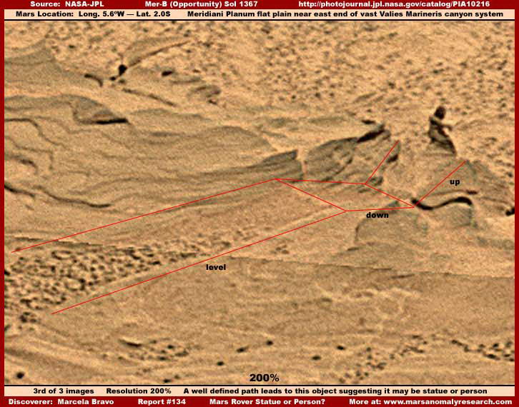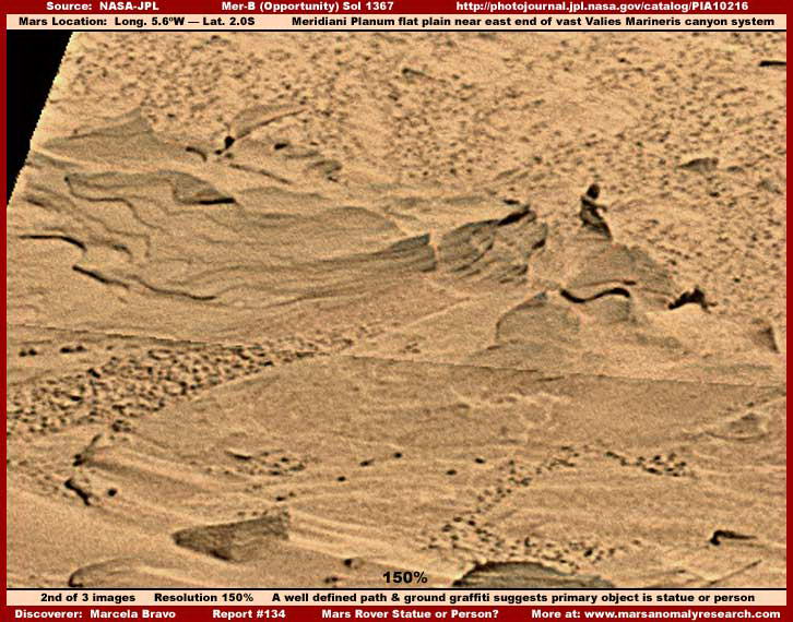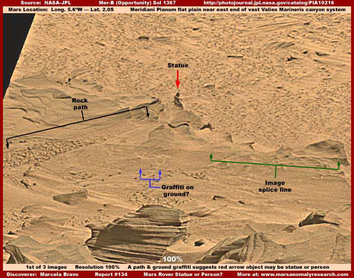 A fenti első kép egy olyan bizonyító erejű hely, amire egy néző, Marcela Bravo hívta fel a figyelmünk 2008. január 10-én. A hivatalos képfelbontást megtartva, a fenti, szélesebb területet ábrázoló nézetben, láthatunk egy kis alakot, piros nyíllal megjelölve, ami erősen hasonlít egy ülő vagy térdelő helyzetben levő személyre a Marson. Ezt a tájat a Spirit marsjáró nagy látószögű fényképezőgépe vette fel a Sol 1367-kor. Először csak fekete-fehér http://marsrovers.jpl.nasa.gov/gallery/all/2/p/1367/2P247720343EFFAWCCP2415L7M1.JPG képen láthattuk, majd felbukkant a fentebb látható hamis-színes felvétel, majd a széles látószögő, a teljesen bevörösített, azaz a „megszokott" változat is, ez utóbbi a West Valley Panorama NASA Photojournal PIA10216 bemutató kép részeként http://photojournal.jpl.nasa.gov/catalog/PIA10216 hivatkozva. Nyilvánvalóvá vált, az utóbbi képen is feltűnt, Marcela Bravo felfedezte ezt az alakot a kép szélén, illetve az eredeti széles panorámaképnek a bal oldalán, majd a figyelmünkbe ajánlotta. Ahogy kiderült, ez perdöntő és jelentős felfedezés lehet. A fenti első kép szélesebb látómezőjében figyelje meg a hosszú vékony vízszintes vonalat, melynek jobb oldalára mutatnak a zöld nyilak. Ez arra utal, hogy a felvételt a PIA10216 jelű panorámaképekből nyerték ki, ezek inkább korábbi kisebb tudományos adatképek mozaikjai, mint az eredeti Sol 1367 nyers adatképe. Azért tettük ide, hogy megmutassuk, a függőleges figura jelenlétére vonatkozóan és a mellett van más fontos objektum is ezen a helyszínen. Egy sereg közvetett bizonyíték révén, lehetségesnek tűnik, esetleg halvány falfirka betű és/vagy szám látható a földön, amit a kék nyilak mutatnak. Különös észrevétel az ötös szám, amire a jobb oldali kék nyíl mutat. Ha önmagában tekintjük, ez a bizonyíték elutasítható, mint a sötétebb és világosabb tónusok lehetséges variációja a talajon, de ha az átfogóbb helyszíni bizonyíték részeként tekintjük, a valószínűségi faktor hajlamos csökkenni, és a bizonyíték kezd jelentősebbé és sokatmondóbbá válni. Még asszociatívabb bizonyíték, miszerint úgy tűnik, egy szándékosan elhelyezett kövekkel felszórt út vezet a fekete nyíllal jelzett figurához. Ez az útvonal kissé túl egyenesen éppen az alakhoz fut, párhuzamos oldalai mentén nagyon egyenletes a szélessége, és a figura túl pontosan éppen középen van (az úthoz képest) ahhoz, hogy ez véletlen elrendezés legyen, főleg, ha a figura jelenlétét tekintetbe vesszük. Az emberi hajlamos lenne csak a drámaibb humanoid alak jelenlétére összpontosítani, ám ez hibás lenne, mert lehetővé tenné a zártabb elméknek, hogy a földtani formák abnormális véletlen alakzataként magát az alak jelenlétét utasítsák el. Mindazonáltal a figura létezik, más, alátámasztó bizonyítékok összefüggésében, aminek semekkora részét sem kellene figyelmen kívül hagyni, mert a bizonyítékok teljes összefüggése az, ami fontos és sokatmondó.