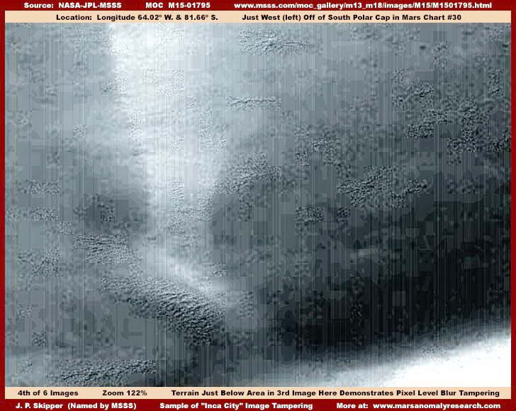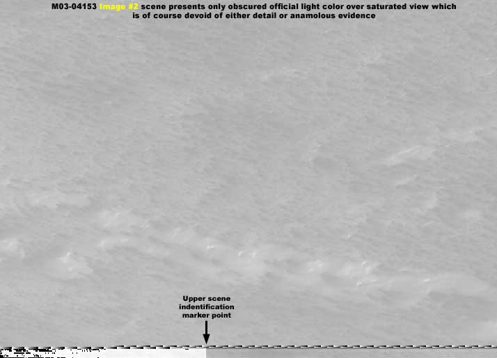 A fenti, bal oldali, első felvétel az MGS MOC M03-04153 jelű, keskeny látószögű fotócsíkot eredeti, hivatalos méretének 7%-ra kicsinyítettünk. Az ábrázolt terület a Mars Déli Sarkvidékének térségét mutatja, közvetlenül a déli pólustól jobbra. Itt csak azt szeretnénk bemutatni, mekkora mértékben van szándékosan kivilágosítva, és ködös pacákkal telerakva a fotócsík teljes hosszában. A közvetlen mellette levő második felvétel már 140%-os nagyítással ábrázolja a helyszínt a hivatalos mérethez képest, láthatjuk rajta, az egész fotócsíkon alkalmazott hamisítás miként hat annak részleteire, miként teszi felismerhetetlenné a felszín valamennyi részletét. Természetesen nincs is mit beszélni róla többet.