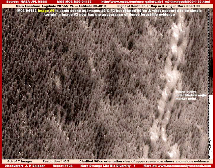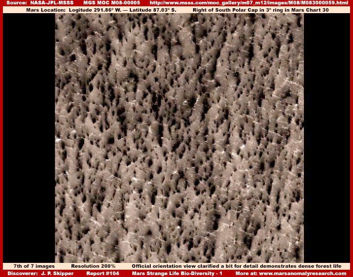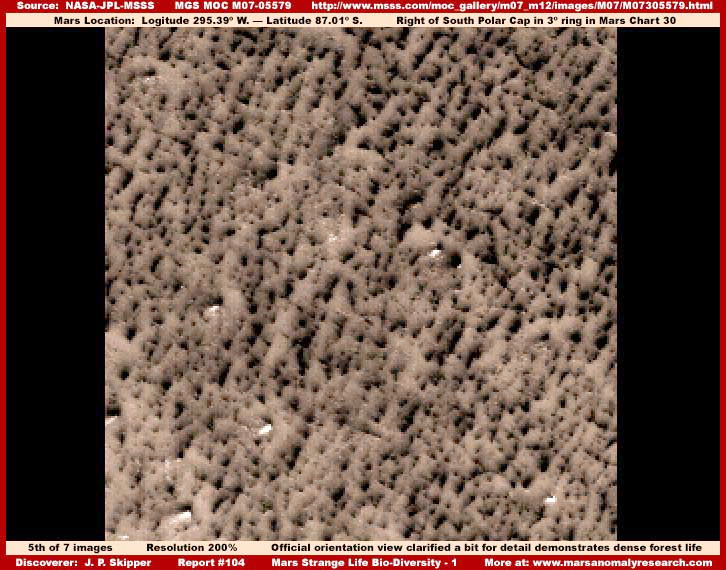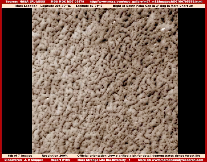 A fenti, hatodik felvétel, ugyancsak az M07-02279 fotócsíkból való, miként az ötödik kép, azonban annak más területéről. Figyeljük meg, az erdőség itt sűrűbb, szorosan kötött és kevert képet mutat az ötödik felvételhez képest, ahol kevésbé kötött és kevésbé sűrű – összehasonlításképpen. Nem kelt olyan benyomást mintha egy pénzérmét aládobva és elvárván, hogy működik a dolog, az áthatolna ezen a rétegen és elérné az alatta lévő természetes geológiai felszínt? Figyeljük meg mennyire kerekded, lágy kinézetű, sűrű és szorosan tömött az erdőség a negyedik felvételen, miközben ismétlődő sötét-világos, jól szervezett mintázatot mutat, ez pedig igencsak tipikus e sűrű erdei élet vonatkozásában. Ezért tettük ezt a megjegyzést, mert néhány megfigyelő hajlamos lehet a negyedik és ötödik felvételen látható erdőséget kissé más jellegűnek értékelni, holott ugyanarról a dologról van szó. Azonban a teljes fotócsík áttekintése, melyről a negyedik és ötödik képrészletet vettük megerősíti, hogy ugyanarról a jelenségről van szó, a vizuális átmenet folyamatos. A világos színű részek a növekvő egyedek, a sötét foltok pedig a növekvő egyedek közötti árnyékos területek. Az olyan kinézésű erdőség mint ez is, meglehetősen szokatlanul hat a földi szem számára, e megjelenés pedig megnehezíti a közvetlen felismerést, miszerint valamiféle erdőséggel állunk szemben. Másrészről, a sziklák és a talaj minden esetben sziklákat és talajt jelent, ahol csak előfordulnak, sokkal ismerősebbek az emberi szem számára. Amit itt láthatunk azonban semmiféleképpen sem mutat sziklákra vagy talajra emlékeztető jellegzetességeket. Ez pedig azért van, mert a sűrű, biológiai eredetű szőnyeg, mindent eltakart, elrejti előlünk az alatta fekvő geológiai felszínt. Fontos tudni, hogy az eltérő megjelenés még nem a történet vége. Létezik ugyanennek az életformának magasabbra növő, sokkal lazább megjelenése is, ugyanezen az M07-05579-es jelű fotócsíkon, azonban továbblépünk, egy másik fotócsíkról helyezünk el itt egy képrészletet, mely lényegében pontosan fedi a kívánalmakat.
