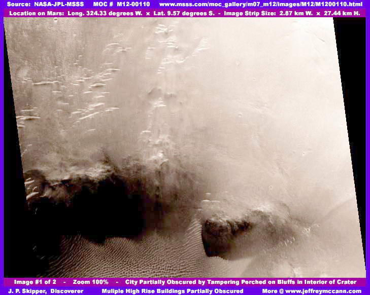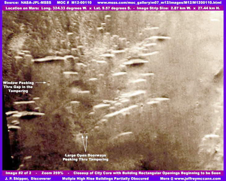 A második felvételen 259%-os nagyítást alkalmaztunk, ezzel el is értük a még használható nagyítás határát; megpróbáltuk áttörni a homályt és alaposabban megfigyelni a város központját, de csak részsikerekkel jártunk. Azonban, talán elegendő ismeretekkel rendelkeznek már Olvasóink ahhoz, hogy felismerjék, a ködös réteg alatt egy városközpont hatalmas épületei rejtőznek, az épületek alapjait viszont sötét, foltos, hamis ködréteg takarja. Ha valaki közelről megvizsgálja, megtapasztalhatja, hogy az eredeti ötlet szerint az épületek oldalát igyekeztek elrejteni, a beszédes többszörös ablakokkal és ajtónyílásokkal az alapjaiknál, a felső részeket viszont igyekeztek inkább megtartani eredeti formájukban, hogy létrehozzák a természetesnek látszó oszlopos formákat. Vagy azt hihetné valaki, hogy hullámzóan tomboló tüzet lát, vagy homokvihart, mely csak a kiválasztott területeire fejti ki hatását és hozza létre ezeket az alakzatokat? Önnek kell döntenie. Feltétlen jegyezzük meg, a hegyfokra illeszkedő szögletes formák legnagyobb része, a képrészlet tetejétől az aljáig, egészen rendkívüli módon öltenek mértani alakot, egyben súlyos képhamisítási eljárások alá is esnek. Szinte el sem tudjuk képzelni, milyen lehetett az eredeti látvány. Habár a fenti helyszín zavaros, köszönhetően a ködösítésnek, nézzük meg nagyon közelről a felvételt, ahová a nyilak mutatnak, és az épületekre vonatkozó kijelentések máris kézzelfoghatóbbá válnak, hiszen tökéletesen szabályos és szögletes objektumokat láthatunk, közöttük kis térség, egyébként pedig a mindent elfedő képhamisítási réteg. Ha valaki közelről megnézi a képet és még annál is közelebbről, megtalálhatja a kicsiny, szögletes nyílászárókat, igen nagy számban, ahol a képhamisítási réteg kissé vékonyabbá válik. Különösen igaz ez a nyilakkal jelölt helyekre. Nagyon nehéz kivenni, de ott vannak. Felhívnánk még arra is a figyelmet, hogy az épületek teteje kissé túlságosan világos, ez annak köszönhető, hogy Skipper némi kontrasztjavítást alkalmazott a felvételen, az általános ködösítés valamelyest kijátszására; az épületek és az őket elválasztó terek kicsit jobban látszanak, valamint az épületeken található nyílások is. A megnövekedett fényerő a kompromisszum miatt van. Hozzátesszük ehhez, hogy újra és újra átnéztük a marsi felvételeket, s megállapíthatjuk, hogy a magas, sűrűn egymás mellé rendezett épületek formai megjelenése igen jellemző a nyílt felszíni és a kupolák alatt épített épületek esetében. Azonban mindez kétségtelenül lehet egyoldalú felfedezés, hiszen szinte lehetetlen további részleteket kivenni ezen a szándékosan lerontott minőségű képen, de ez áll rendelkezésünkre, ezt kapjuk a MOC – egyébként kitűnő minőségű – fotóiból. Nyilvánvaló, hogy akik a képhamisítást végzik, sokkal jobb minőségű felvételek állnak rendelkezésükre, annál sokkal jobb, amit nyilvánosságra hoznak, s a hamisítást végző automatikus számítógépes programok emiatt igencsak hatékonyak. Nos, ha ténylegesen megkaphatnánk azokat a bizonyos nagyfelbontású fotókat, azokon már ténylegesen azt is látnánk, ami ott van.