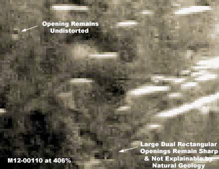 A fenti, harmadik felvételen, melynek elhelyezését a beszámolóban Skipper az utolsó pillanatban döntötte el, immár 406%-os nagyítást láthatunk, a pixelezettség erősen megjelenik, ez igencsak zavaró; minden egyes pixel megmutatja magát. Azonban, az ok, ami miatt elhelyeztük itt ezt a fotót, az az, hogy ahelyett, hogy a szögletes, civilizációs eredetű nyílások – felcímkézve láthatók a második felvételen -, nem válnak olyan zavarossá, mint az összes többi - a pixelezettséget illetően -, továbbra is teljesen jól beazonosíthatók, miközben minden mást elfed a képhamisítás. A fentiek azt bizonyítják, hogy a félig átlátszó, pacázási tényező tovább rontja a felbontást, együttesen alkalmazták e technikát a részletek elmaszatolásával; a véletlenségből kimaradt épület felső-részek továbbra is jól láthatók, a már említett ablakokkal/ajtókkal/elválasztó terekkel együtt, azaz ebből is látható, a felvétel eredeti felbontása messze jobb volt annál, amit itt most láthatunk, sokkal erősebb nagyítást alkalmazhatnánk, ha nem uralnák el a fotókat a képhamisítási alkalmazások. A fentiek bizonyítják, az eredeti felvételek valóban nagy felbontáson készülnek, azután különböző „kezeléseknek” vetik őket alá. Ezzel az esettel is példát szerettünk volna bemutatni miként hamisítják meg a MOC valamennyi felvételét. Ha valaki felületesen néz meg egy ilyen felvételt, hajlamos továbblépni rajta, a hivatalos szervek pedig rutinszerűen alkalmazzák ezt az eljárást. Ha érdekes nyomokkal találkozunk azok mindig fontosak számunkra, akárhol csak találkozunk velük, rendkívüli jelentőséggel bírnak.