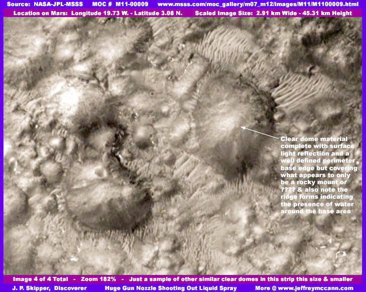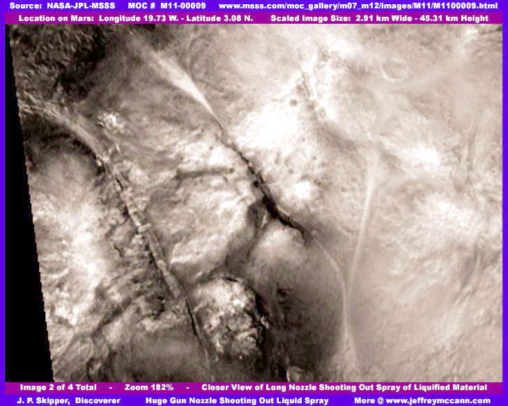 Ennek a beszámolónak a kezdetei egészen 2000-ig nyúlnak vissza, amikor Skipper először bukkant több ízben is egy bizonyos felszíni formára a Marson, és már akkor gyanakodott, hogy nem természetes felszíni alakzatokról van szó, hanem sokkal inkább civilizációs nyomokról. A gond ott merült fel, hogy nem sikerült kulcsfontosságú igazolást találni, ezért nem kockáztatta meg, hogy túl magasra kinyújtsa a nyakát e témában. Mostanra gyűlt össze annyi bizonyosság, az itt látható „vízágyú” fúvókájának kapcsán, mely a mellékelt első és második felvételen tekinthető meg, amint valamiféle folyadékot spriccel ki. Figyeljük meg, hogy a folyadék egységes formában lép ki, majd gyorsan széthullik cseppekre, és szétterül, miként azt a nagy nyomással kiömlő folyadéktól el is várjuk. Vegyük észre, hogy a fúvóka és a még egységes víznyaláb árnyékot vet, ezt ha halványan is, de tisztán kivehetjük a felszínen, közvetlenül a vízsugár alatt, amint az nyíllal és felirattal is jeleztük. Az árnyék bizonyítja, hogy valami olyasmiről van szó, ami a levegőbe emelkedik, nem pedig holmi árnyék- és fény játékáról.