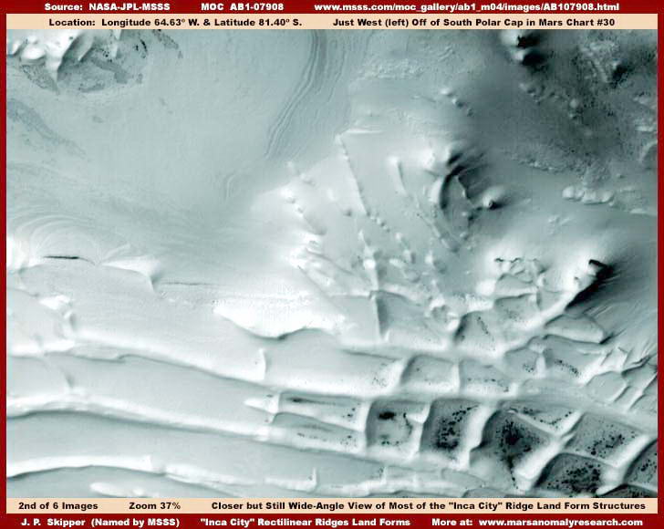 Valamennyi, az „Inka városról” készült felvétel igen nagy távolságból készült, ráadásul a nagylátószögű kamerával, különösebb nagyítás tehát szinte lehetetlen. Az egyetlen kivétel a fenti, AB1-07908 jelű felvétel, ez ugyanis keskeny látószögű felvétel, és viszonylag jól nagyítható is. Az érdekes alakzatokkal zsúfolt terület nagy része látható rajta, ráadásul aránylag tisztán. Az egyes „dobozok” belsejében megfigyelhető sötét foltok telepes élőlények nyomai, valószínűleg valamiféle gombák, életciklusuk vízhez kötött, vagy hóhoz/jéghez kapcsolódó állapotában, azonban jelenleg másra koncentrálunk, az említett élőlényekről más beszámolókban részletesen foglalkozunk. A képhez némi kékes-ciános árnyalatot adtunk, hogy a hómezők megjelenése jobban érvényesüljön. Továbbá, úgy tűnik, ennek a színnek az alkalmazása több részlet meglátását biztosítja. Úgy gondoljuk, a hosszú, balról jobbra futó, szakadozott dombhát hóval fedett az év bizonyos időszakában, ezért láthatunk erről a helyszínről oly sok különböző képet. Ha valaki idáig eljutott, akkor a dolgot továbbgondolva arra is rájöhet, hogy ezek az alakzatok arra szolgálnak, illetve az a feladatuk, hogy az olvadékvizet elfogják és tereljék – hihetetlen méretekben. Ne felejtsük el, a Marson a vízgazdálkodás rendkívül fontos kérdés.