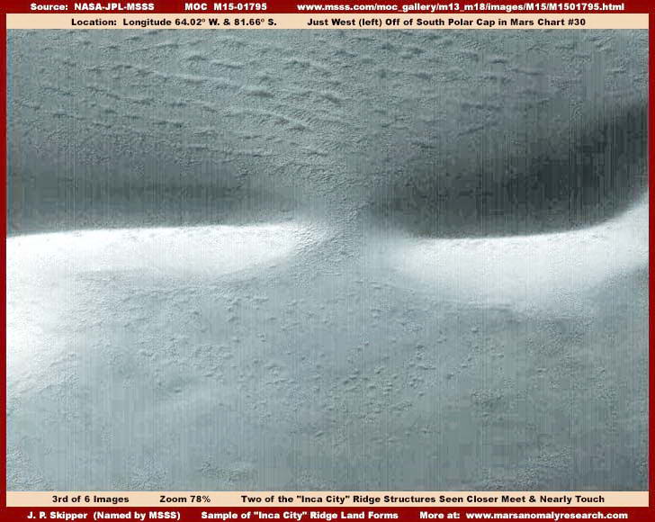 Miként az látható az első, M07-02825 katalógusszámú felvételen, ezek a kiemelkedő formák igencsak egyenes hátakból állnak, s megtaláljuk szép számmal a derékszögeket is, sőt, olyan részekkel is találkozhatunk, ahol mindjárt négy is van belőlük egyszerre, teljesen szabályos négyzetet alkotva. Valamennyi hegyhát-alakzat meredeken emelkedik fel, éles körvonalakat mutat, keskeny felső része van, meredek és sima oldalai. Úgy tűnik, mintha az üledék megkötésére, mozgásának megakadályozására alkották volna meg ezeket a formákat. Nehéz azt hinni, hogy a természet hozta volna létre, miközben a hivatalos magyarázat természetesen ezt állítja. Fontos tisztában lenni azzal, hogy az első és második felvétel nagylátószögű kamerával készült. Az első felvételen eszerint kb. 100 km szélességű területet fog át a látószög, már amennyiben hihetünk a statisztikai adatoknak. Tegyük fel ezek az adatok hitelesek, ebben az esetben e szárazföldi formák kiterjedése teljességgel elképzelhetetlenül hatalmas. Ne felejtkezzünk el arról sem, hogy szemünk mindig igyekszik valamiféle léptéket keresni, s ebben az esetben ezeket a gigászi méreteket jóval szerényebb nagyságúnak, valami ismerős mérethez, igazítani. Vagyis, jelen esetben kolosszális méretekben kell gondolkozni!