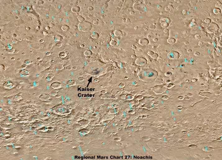 A fenti, első kép igen széles területet ábrázol a déli féltekéről, a Mars Noachis régióját, a Kaiser-kráterre fekete nyíl mutat. Az itt bemutatott felszín déli határa a Déli Sarki terület, az északi határa pedig a Kaiser-kráter, egyben a tanulmánynak is fő témája. Figyeljük meg a jellemzően sötét színű foltot a kráter központi vidékének térségében, aztán vegyük észre azt is, hogy számos további kráter ugyancsak rendelkezik ilyen sötét belső folttal, különböző mértékben. Ha valaki ezen elgondolkodik, arra juthat, hogy a sötét területek gyakran utalnak víz jelenlétére a kráterek alján, a legtöbb esetben azonban ezeket a kráterek mélyén megjelenő sötét foltokat a hivatalos magyarázat mint sötét, üledékes területet írja le, geológiai eredetű dűnéknek, vagy homokdomboknak, és soha nem mint víz előfordulási helyeket, vagy bármi olyasmit, ami különösebb érdeklődésre tarthatna számot. Néhány esetben valóban sötét anyagból felépülő üledékes eredetű dűnékről van szó, ám az igazság legtöbb esetben más, viszont így nagyszerűen elterelhető róla a figyelem. A legtöbb esetben, mint már oly gyakran láthattuk, a dűnék egészen mások, gyakori a dűne-megjelenés utánzása a képhamisítási alkalmazások során. A legtöbb esetben tehát valamiféle mesterségesen felvitt objektumok, szemfényvesztés keltésére, elrejteni valami fenyegető (a titkos hatalom szempontjából) dolgot a geológiai eredetű dűne utánzása révén, miközben a valóban a felvételen levő objektumok mibenlétéről legfeljebb csak sejtésünk lehet, vagy még az sem. Néhány esetben felszíni víz, illetve biológiai élet nyomainak eltüntetését kísérlik meg, mint jelen esetben is, e beszámolóban pedig éppen ezt az esetet tesszük górcső alá. A helyzet az, hogy a sötét színnel mutatkozó terület igen sokféle eredettel rendelkezhet, értelmezése nem olyan egyszerű, miként azt a hivatalos magyarázatok sugallják számunkra. A mesterséges eredetre kissé jobban rávilágítunk a „Szemfényvesztés a marsi Kaiser-kráter térségében” – című írásban. Jelen beszámolóban megvizsgáljuk néhány mintán keresztül, vajon mi lehet az eredete a sötét színű területeknek a Kaiser-kráter belső térségében. E vonatkozásban beszélünk felszíni víz jelenlétéről, valamint biológiai eredetű erdei életről. Miért vetik el újra és újra ezeket a felvetéseket? Egyszerűen azért, mert miközben a bizonyítékokat felépítjük, folyamatosan és kiemelten hangsúlyozzák, a Mars csontkeményre fagyott, száraz világ, légkörének elsődleges összetevője pedig, a széndioxid, minden általunk ismert életformára veszélyes – és már sikerült is eltávolítani a nyilvánosságot a planetáris tényektől. Logikus, hogy az ilyen típusú kráterek, mint a Kaiser-kráter is, mélyen benyomódnak a felszínbe, ha pedig a környező talajban folyékony víz található, és nem túl mélyen, legalábbis nem mélyebben, mint a kráterfenék, akkor joggal várhatjuk, hogy a talajrétegeken átszivárogva kilép a felszínre, végigcsordogál a kráterfalon és összegyűlik annak legalsó pontjain. Természetesen az átlátszó felszíni vízen a napfény képes áthatolni, s melegíteni az alatta fekvő felszínt, miközben a felszínről visszaverődő fényt és hőt részben csapdába ejti. Ebből is adódhat a kissé sötétebb árnyalat. Továbbá, ha tartósan van jelen víz a kráter fenekén, akkor sokkal összetettebb életformák is kialakulhatnak, várhatóan, kifejezetten szaporodásnak indulnak ezeken a számukra kedvező feltételeket nyújtó részeken. A legtöbb általunk ismert életforma, különösen az, amelyik függőleges irányban növekszik, egyrészt árnyékot vet, másrészt elvárhatóan ugyancsak elnyeli a napfény egy részét, akár felépítése és működése révén, akár az árnyékhatás jelentkezése révén. Soha ne felejtkezzünk meg róla, hogy a nyilvánosság számára elérhető műholdas felvételek felbontását szándékosan lerontották, tömörítették őket, és nagymérvű hamisításon is átestek, ezért csak az igen nagyméretű objektumokat láthatjuk, vagy pedig kiterjedt területeket, ahol a részletek nagyjából hasonlatosak, viszont a legritkább esetben találkozhatunk egyedi formákkal, miként azt a Földön megszoktuk. Azt is tartsuk szem előtt, ha olykor szemünk elé kerülnek méretes alakzatok, vagy alakzat-csoportok, az őket mutató fotók felbontása is lerontott, a részletgazdagság szegényes, tehát igencsak óvatosnak kell lennünk a felvételek elemzésekor. Amit itt látni fogunk a Kaiser-kráter kapcsán nem más, mint hatalmas méretű biológiai életterek, melyek sajnos szinte semmit sem mondanak az őket felépítő apróbb életformákról, netán az éppen itt megfigyelhető biológiai környezetre alapuló intelligens életformákról. A nyilvánosság számára elérhető felvételek felbontása túlságosan is gyenge, nem teszik lehetővé azon a léptéken való vizsgálódást, melyet az objektumok mérete felölel, de biztosak lehetünk benne, valójában ott vannak. Jelen beszámoló első részében a fotókat az S09-01561 katalógusszámú tudományos adatcsíkból vettük. A tanulmány második felében tovább folytatjuk az elemzést, de további fotócsíkokat használva, egyben azt is igazolva, hogy az itt bemutatott jelenség nem véletlenszerű, nem valamiféle szokatlan jelenséget képviselne, s mindösszesen egyetlen fotócsíkra korlátozódna.