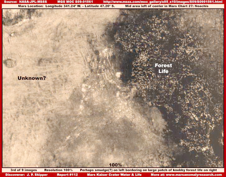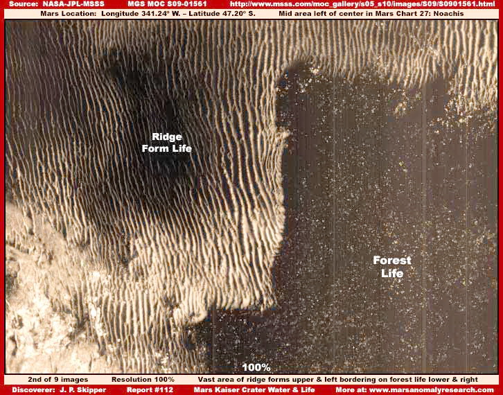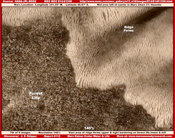 A fenti, második felvétel csupán kis részét ábrázolja a hatalmas területnek, a bal felső részén pedig felfedezhetjük a már jól ismert párhuzamos „barázdákat”, jobb elnevezés helyett használjuk ezt a fogalmat, merthogy úgy néznek ki. Skipper már hosszú évekkel ezelőtt levonta a következtetést, ezek a formák egyértelműen élet jelei, még akkor is, ha az számunkra szokatlan. Amikor erre az életformára úgy tekintünk, hogy a részletek is némiképp felismerhetők, mint itt is, a feltételezés rögtön adódik, egyúttal az enyhe lejtőkön aláfolydogáló sekély vízzel is dolgunk van. A párhuzamos sorok csatornákat alkotnak a vízfolyásoknak, kapcsolatban állnak azokkal, használják őket, és tőlük függnek. A lerontott felbontás természetesen nem elegendő a sekély, folyékony állapotú víz megpillantásához a keskeny és mély csatornák alján a párhuzamos gerincek között, de lefogadhatjuk, valóban ott vannak. Továbbá, a barázdaformák sűrűsége azt jelzi, igencsak régóta állnak már mai formájukban, azaz az enyhe lejtőkön aláfolydogáló sekély víznek is nagyon régóta jelen kell lenni. Másrészről, a sötétebb, tömött alakzat a jobb oldalt és a felvétel alsó részén valamiféle erdei életet képvisel, sokkal inkább símább felszínhez kötődve. Ha jelen lehetne földi szem a helyszínen, akkor ezt az erdőségek elképzelhetetlenül sűrűnek tapasztalná, a mi fogalmaink szerint, de közel sem számítana olyan tömöttnek összevetve a Déli Sarkvidék erdőségeivel, nem sokkal délre jelen helyszíntől. Habár nem láthatjuk az erdőség folytatását a jobb oldalon, feltételezhetjük, valóban nagy területet foglal el, még a mi fogalmaink szerint is, azonban csak kis részét láthatjuk, éppen azt, amelyik közvetlenül kihasználhatja a sekély víz jelenléte által kínált előnyöket a barázda-formák tövében. Mindezek ellenére, itt valószínűleg csak egy erdőfoltot láthatunk, nem a már jól ismert, nagy területet elfoglaló formát. Az itt megfigyelhető életforma inkább látszik hagyományos, fás-jellegű erdőségnek, igen magasra törő lombozattal, sűrű növésű törzsekkel, azaz idős erdőségnek. Habár a teljes terület igen sötét, köszönhetően a képhamisítási beavatkozásoknak, ám természetesen a nagyobb fényelnyelő-képességnek is. Elég jelentősen világosabbra kellett venni a fotót, hogy ezt a kevés részletet is ki lehessen hozni belőle. Továbbá, habár nyilvánvalóan nem valamiféle különleges geológiával állunk szemben, meglehetősen csomós szerkezetű, és nagyjából pontosan ugyanúgy néz ki, mint a többi, a Marson található hagyományos erdőség, arra sarkallván minket, hogy ezt a területet is erdőségnek azonosítsuk be a jól ismert fák lombkoronája alapján. Más szavakkal, habár nagy bizonyossággal kijelenthetjük, hogy növényzettel van dolgunk, a kinézete alapján erdőséggel, de ennél további részlettel nem tudunk szolgálni. Az egyetlen jó dolog a fenti helyszínnel kapcsolatban az, hogy igen jó összehasonlítási lehetőséget kínál egy fajta, s a neki tökéletesen ellentétes megjelenésű másik fajta életnyomok között. Mindkettő ragyogóan fejlődik, nagy sűrűségben tenyészik, tökéletesen betölti a lehetőségére álló életteret. A barázda-formák nem kifejezetten érdeklődnek a sík terület iránt, ahol összegyűlik a víz és nincs folyamatos áramlásban, illetve az erdőségnek nem áll szándékában elfoglalni az enyhe lejtőket, ezért a kétféle életforma között a határvonal éles. Egyik sem ad át a másik számára egyetlen centimétert sem, mi pedig nem kaphatunk ennél beszédesebb különbséget.