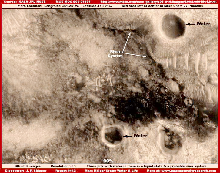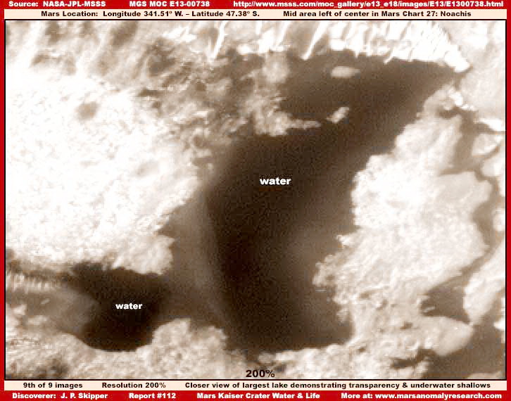 A fenti nyolcadik kép, ha valaki elkezdi alaposabban megvizsgálni, meglehetősen drámai. Valójában olyannyira, hogy sokak számára bizonyára teljességgel hihetetlen a látvány, főleg ami a tudósokat illeti. Valamennyi közül az egyik legmeggyőzőbb víz előfordulási helyet láthatjuk, Skipper évekig nem is tette közzé, készülő könyve számára tartogatta. A fentebb látható valamennyi sötét színű rész, legyen az akár kisebb, akár nagyobb, vizet jelent. Gyakran az ilyen sötét foltok lényegében képhamisítási alkalmazások és éppen vizet rejtenek el előlünk, megtartva mégis valamit annak eredeti megjelenéséből; általában nem szoktunk szót ejteni erről minden egyes alkalommal. A Mars esetében a nagyon sötét szín ugyancsak jelentheti sekély vízben gazdagon burjánzó zuzmó jellegű formák életközösségét, ilyen esetekben lényegében felváltja a víz felbukkanási helyeit, ám továbbra is szoros hasonlatosságot mutat, hiszen például követi a partvonalakat elterjedése, stb. Általában ezeket sem említjük meg külön, mivel úgy gondoljuk, az olvasók többsége még nem szerzett akkora rutint, hogy meggyőződéssel felismerje. Itt azonban vízre tekinthetünk alá, méghozzá igen sokra, ráadásul nem fagyott állapotban. A hamisítást végző számítógépes program bizonnyal elnézte, tekintve a durva, szabálytalan és egyenetlen partvonalakat, hiszen a legkülönfélébb formákkal találkozhatunk, emellett pedig hiányzik a vízfelszín fényvisszaverő-képessége. Miként azt többször említettük, a számítógépes program igen jó, de nem tökéletes. Igen hatékonyan működik pontos geometriai szögek és mintázatok esetében, ám közel sem ennyire hatékony kerekded formák esetén, kivéve, ha geometriai alakzatokkal társulnak és még rosszabb a hatékonyabb durva, szabálytalan formák esetén. Éppen a láthatóság határán, a kivágott képrészlet aljánál, hosszan elnyúló lejtős terület kezdődik, arra utalva, a Kaiser-kráter hatalmas bemélyedésének legalján járhatunk, vagy ahhoz igen közel. Az oldalfalában megfigyelhetünk számos vízfolyást, a víz legnagyobb része azonban megmaradt a kisebb-nagyobb tavakat alkotó vízfolyás-rendszerben, mivel pedig túlfolyásokat láthatunk, lefelé csörgedezve a lejtős területen, adódik a következtetés, az elfolyó víz fokozatosan pótlásra kerül, azaz nagy tömegben kell jelen lennie. A víz összegyűlik ezekben a kisebb-nagyobb „zsebekben”, aztán olykor túlfolyik peremükön, távolabbra és mélyebbre, a kép alja felé, ahol ebből a mélyebb területből láthatunk egy kisebb részt. Ezek a vízfolyások erodálják a lejtős terület oldalfalát, az olykor egész tekintélyes bevágódások jól láthatók. Fontos megállapítás, az egymásba épülő vízgyűjtő medencék igen hatalmasak. Az is látható, a partvonaluk folyamatosan változhat az áramló víznek köszönhetően. A képen már nem látható az alsó részről kiinduló lejtős rész legmélyebb része, ahol ugyancsak találkozhatunk folyékony víz jelenlétével, de nem ilyen látványos módon. Ez pedig arra utal, hogy habár tekintélyes mennyiségben találhatunk belőle ezen a sima és magasabb részen, jelenléte azonban erősen átmeneti és/vagy periodikus lehet.