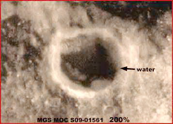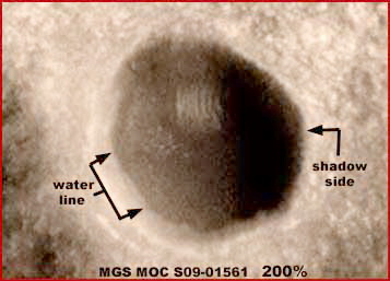 A legnagyobb vízgyűjtő mérete lehetővé tesz egy kissé közelebbi elemzést, ezt láthatjuk a következő képen. Még egy hozzá nem értő is könnyedén felismeri a tökéletesen tisztán kivehető, csipkézett, sötét színű partvonalakat, melyek egyértelműen igazolják a mélyedéseket kitöltő, a szintjét önmaga szabályozó, folyékony közeg jelenlétét. Még egy hozzá nem értő is megláthatja a világosabb színű, a sekélyebb részek alatt húzódó domborzat tónusait, ezek sötétedését, ahogy a víz mélyül, igazolván a folyadék átlátszósági tulajdonságait. E jelenséget a különösen a jobb oldalt hosszasan elnyúló partvonalnál tapasztalhatjuk. Akár fogadást is köthet bárki, hogy az igen béna hivatalos magyarázat szerint, semmi másról nincs szó, mint sötét, üledékes anyag felhalmozódásáról, netán homokdűnékről, e mélyedések alján. Pontosan ezen ok miatt igyekszünk felhívni a figyelmet a sötét folyadék átlátszósági vagy áttetszőségi tényezőjére, valamint a szintjét önmaga szabályozó képességére, ahogy az nagyszerűen látszik az egyformán magas partvonalakon mindenfelé a térségben, miként az eróziós csatornák is a vízgyűjtők oldalfalain. Egyértelmű, ezek a tulajdonságok folyadékra jellemzők, semmiféle szilárd anyag szóba sem jöhet. Más szavakkal, semmiféle rakétatudósra vagy bolygóközi geológiával foglalkozó szakemberre nincs itt szükség, elegendő csupán a puszta szem és némi józan gondolkodási képesség. Továbbá, e felszíni vizek egyetlen egy helyen sincsenek befagyva. Vegyük észre, hogy az itt található víztározók különféle méretűek, közöttük akad néhány kisebb és sekély, ha pedig a rendkívüli hidegre vonatkozó hivatalos álláspontot elfogadnánk, ezeknek bizony kőkeményre fagyottnak kellene lenniük. Tegyük fel, folyamatosan geotermális eredetű hő tartja a tavak vizét olvadt állapotban, ebben az esetben viszont az - állítólagosan - rendkívül hideg levegő miatt állandóan vízpárának kellene jelen lennie, ennek viszont nyomát sem látjuk. A dolog kézenfekvő, sokkal enyhébb körülmények uralkodnak a Marson a hivatalos állásponthoz és a műszerekre hivatkozva közölt adatokhoz képest. A fenti, folyékony víz előfordulására utaló nyomok meglehetősen hangsúlyosak, ám korántsem ez egyetlen jelentős helyet képviselik ezen a területen. A képen látható helyszín egy lefolyási csatornákkal szabdalt, nagyobb bemélyedés északi részét foglalja el, azonban a fotócsík lentebbi területein és délen, a bemélyedést keresztezve, nagyjából ugyanezen a magasságon, további víz-előfordulási helyekkel találkozhatunk. Szintén igen jelentős bizonyítékkal szolgálnak, ám az itt bemutatottnál elmosódottabbak, ezért nem illesztettük ide őket. Rettenetesen szomorú, hogy az egyszerű kutatóknak, mint amilyen jómagam is vagyok, s csak igen kevés idővel rendelkezem, mellette korlátolt minőségű felszereléssel és forrásokkal, kell az ilyen típusú bizonyítékokra felhívni szerte az akadémikusok, a tudósok és a bolygóközi planetológusok figyelmét, akik jól megfizetett, teljes állásban végzik tevékenységüket, és nem hajlandók észrevenni az orruk előtt meredező, a szemüket majd kiverő, nyilvánvaló tényeket. Nos, nézzünk szembe az igazsággal, vezetőinknek eszük ágában sincs szembesülni a valósággal, és nem is fogják megtenni mindaddig, amíg nem lesz más választásuk. Ez az a pont, ahol a Bolygóközi Igazság Projekt megtalálja a maga célját, és komoly fenyegető tényezőként jelent meg 2007-ben. Ehhez a mozgalomhoz egyre többen csatlakoznak független kutatók, akik munkájuk során mind több és több egyértelmű bizonyítékot tárnak a nyilvánosság elé, mint ez is, minek köszönhetően növekszik azok száma, akik a dolgok mögé látnak, egyben pedig a mozgalom támogatottsága is. Egy idő után már annyian lesznek, hogy megkerülhetetlenné válnak, a vezetőinknek nem lesz más választása, mint foglalkozni a kérdéssel. Ti ott, a titkos hatalom képviselői, jobban teszitek, ha nagyobb figyelemmel kíséritek az eseményeket! Minden Kedves Olvasót figyelmeztettünk tehát, ez a figyelmeztetés pedig nem hagyható figyelmen kívül. Ha valaki nem tart még a feladás határán és van elég ereje kiállni az első sorokba, mutatni az utat önmaga és mások számára, ha valóban ideáll az igazság nyilvánosságra hozatala érdekében, a rejtett információk zárolásának feloldása érdekében, akkor a titkos hatalom képviselői előbb-utóbb kénytelenek lesznek számolni ezekkel az erőkkel és minden következményükkel. Akár így, akár úgy, nyilvánvalóvá kell válni, az álmodók ébredezni kezdenek, az igazság órája pedig el fog következni. Aki bölcsen cselekszik, már számol ezzel a lehetőséggel és időben választja meg útját. Az igazság útját.