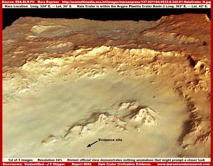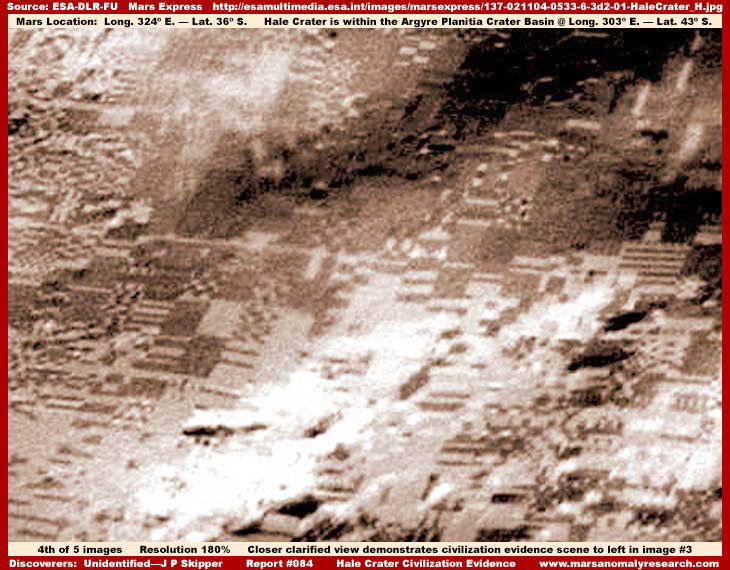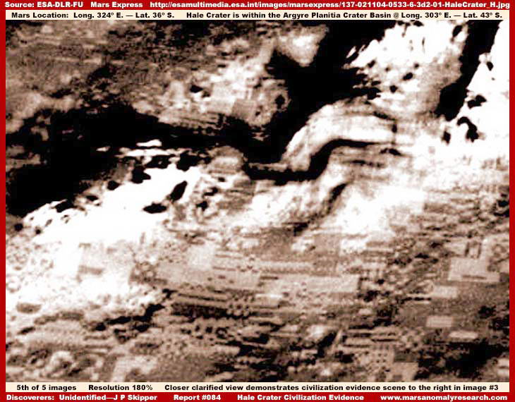 80. Civilizációs nyomok a marsi Hale-kráter térségében A fenti, első felvétel, a Hale-kráter térségét mutatja, egy jóval nagyobb régió részeként, az Argíre Planitia kráter medencéjében. A kép maga csodálatos. Nem igaz? Jellemző a megjelenése, gyakran találkozunk ezzel a fajta látványos fotófeldolgozással az ESA Mars Expressz HRSC (Nagyfelbontású Sztereó Kamera) képeinek gyűjteményéből, miként azokat a nagyközönség és a média számára rendelkezésre bocsátják. Azonban, amivel mindenekelőtt tisztában kell lennünk, a nyilvánosság és a média számára közölt gyönyörű felvételek kapcsán az az, hogy lényegében művészeti alkotások és nem keverendők össze a Mars Expressz kamerái által szolgáltatott valódi vizuális tudományos adatokkal, melyek lényegében sohasem festenek ilyeténképpen. Ezt a nagyszerű kivitelezést itt a Földön végzik el, néhány jelentős mesterséges eljárás kíséretében, miközben természetesen a fotókat is manupulálják, hogy a kívánt megjelenést elérjék. A fotók manipulálásának ténye még nem is lenne akkora tragédia önmagában, ha csak a színekre terjedne ki, azonban az ESA nem elégszik meg ennyivel, súlyos képhamisítási módszereket vet be, kezdve a térkép szerű fedőréteget alkalmazó módszertől, egyéb zavaró technikák használatáig, így a kép minősége már messze nem elegendő ahhoz, hogy felhasználásukkal felfedezések születhessenek. Valójában tehát számítógépes program hozza létre ezeket a szép színeket és a felszín tekintélyes részét. Ezzel a problémával folyamatosan találkozhatunk az ESA által a nyilvánosság számára szánt felvételeken, ennek köszönhetően általánosságban és lényegében időpazarlás velük foglalkozni, hiszen igen nagy erőfeszítésbe kerülne bármit is észrevenni rajtuk. Nem számít mennyire kitűnő a hamisítás, hibák olykor előfordulnak az alkalmazás során, ezek a tévesztések pedig valós információkat hordozhatnak. Ez a helyzet jelen esetben is, éppen erről szól e beszámoló.
