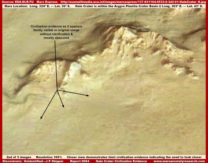 A fenti, második felvétel, ugyancsak az ESA hivatalos gyűjteményéből való (bármiféle módosítás nélkül), azonban kifejezetten a szokatlan objektumokat tartozó térségre korlátozottan, s ezúttal a hivatalos 100%-os felbontáson. Az említett rész a felvétel bal alsó sarkától indul ki és a három nyíllal jelzett szakasztól jobb oldalra terjed ki. A Hale-kráter központi térségéből meghagytuk a centrális krátercsúcsot a könnyebb tájékozódás végett. Miként az egyértelmű, bármiféle szokatlan alakzat csak igen halványan látható a hivatalosan kiadott fotó alapján, ezért igen könnyű eltéveszteni. Az egyetlen kivehető dolog ezen a hivatalosan kiadott képen az a természetes geológiai felszíntől eltérő, halványan kivehető mintázatot mutató terület, melynek főbb vonásai átütnek a részben átlátszó képhamisítási rétegen. A szóban forgó régióra valamivel jobb látványt biztosít a Mars Expressz hivatalos internetes oldalán található eredeti fotó, valamivel kisebb mértékben tömörített, mint az itt bemutatott változat. A kutatók számára érdemes számítógépes technikát bevetni, hiszen ezek a szabályos mintázatok mindenféleképpen alaposabb vizsgálatot igényelnek, hasznos lehet megkísérelni az elmaszatolás és a képhamisítási eljárás leküzdését. Skipper nagyon régóta ismerte e szokatlan helyszínt, még az MGS MOC felvételei kapcsán, de mindig olyan mértékben hamisították, ami lehetetlenné tette a rejtő beavatkozások közömbösítését. Amikor jelentős felismerést tesz valamelyik helyszínnel kapcsolatban, mint például jelen esetben is, gyakran viszatartja a bejelentést abban a reményben, talán jobb felvételhez jut ugyanarról a területről, az idő múlásával, hogy aztán részletesebben lehessen elemezni az adott objektumokat. Ugyanez történt jelen esetben is. Számos felvételt megvizsgált már a MOC, a THEMIS és az ESA archívumából erről a területről, de soha nem sikerült megerősítést nyernie a grafikus beavatkozások következményeként, kutatásai soha nem szolgáltak az elvárható részletességű eredménnyel. Azonban, hálás köszönet egy hölgynek (aki titokban kívánja tartani kilétét), rátalált erre a bizonyos ESA felvételre, melyet Skipper figyelmen kívül hagyott, s egyben ennek a beszámolónak is az alapját képezi. Amikor felhívta Skipper figyelmét erre a fotóra, a rálátás a területre túl közeli volt, a hamisítási technikák pedig olyan erősek, hogy csak sejtetni engedték, valami nincs rendben. Azonban rögtön kiderült, az említett hölgy grafikus alkalmazásai képesek részben leküzdeni a Hale-kráter térségében bevetett hamisítási eljárásokat, ennek köszönhetően pedig értékes tapasztalatra tehet bárki szert. Az eredményt az alábbi három felvételen figyelhetjük meg.