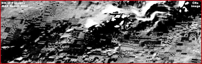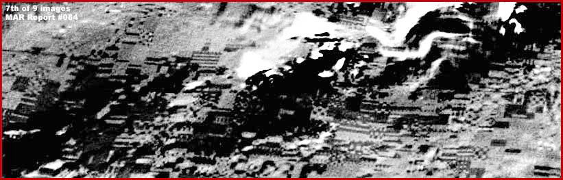 A fenti, negyedik felvételen 180%-os nagyítást alkalmaztunk (eddig lehetett elmenni anélkül, hogy túl zavaros lett volna), közelebbi rálátást kaphatunk a tágas térségre, a jelen beszámoló harmadik felvételétől balra eső részre. Még mindig nagy a távolság és a kép zavaros, ám továbbra is . valamilyen mértékben – informatív. A civilizációs nyomok túl sűrűek itt és sokfélék, ezért nem akartuk összezavarni a látványt különböző nyilakkal és feliratokkal, abból a meglátásból kiindulva, hogy aki a képre tekint, képes felismerni, amit lát, mi is valójában. Ne felejtkezzünk meg róla, távoli műholdas fotót láthatunk, nem pedig közeli légifelvételt, a kép minőségét pedig már hivatali szinten lerontották, ezért az elmosódottság, melyen nem lehet segíteni. Eltekintve néhány civilizációs területtől, mint a „Kupolák, és egy ipartelep által kibocsátott párafelhő”, valamint a „Vízi ipartelep” – című tanulmányokban megfigyelhető, változatos alakú és szerkezetű struktúráktól, ez a térség az eddig bemutatottak között viszonylag különlegesnek számít. Miért is? Azért, mert a civilizációs nyomok nagy területet foglaltak el a felszínen, átfogó változékonyságot mutatnak különböző, valószínűleg ipari és/vagy katonai célokból létrehozott, jobbára alacsony objektumból összeállva, összevetve az igen sűrűn benépesített településekkel és/vagy üzleti központokkal, jellemzően magas és egymáshoz igen közel álló toronyszerű épületeikkel. Továbbá, a viszonylag jól kivehető mintázatok és struktúrák nyomai (mármint a megszokott műholdas felvételek minőségével összevetve) viszonylag kis méretűek és alacsonyak. Mindez azért van, mert a képhamisításkor felkerült áttetsző fedőréteg nem tudta ezeket a kisebb objektumokat egységesen eltüntetni, a megtévesztést alkalmazó módszer nem volt kellően eredményes. Ezt a fajta képhamisítási beavatkozást sikerült egész jó hatékonysággal közömbösíteni. Azonban a sötétebb területek és a szándékosan túlságosan kivilágosított részek, felvetésünk szerint, sokkal könnyebben felismerhető mértani alakzatokat rejthetnek, ezeket a magasabb prioritást élvező, objektum-specifikált számítógépes program már sikerrel eltüntette még jóval nagyobb felbontáson, sokkal mélyebben belenyúlva a fotó grafikus tulajdonságaiba – ezzel a technikával szemben sajnos nem tudunk mit tenni. Az említett objektumok tehát továbbra is rejtve maradnak a jóval inkább egyénre szabott hamisítási beavatkozások miatt. De ne gondoljuk, hogy már „megkaptuk és meg is ettük a sütinket” – ahogy az öregek mondják.