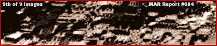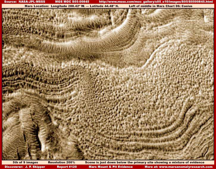 A fenti, kilencedik és egyben utolsó felvétel, csökkentett méretű, az MGS MOC 06-os számú marstérképe, az s05_s10 fotósorozat elemeit mutatja. Figyeljük meg a különbözőképpen elhelyezkedő fotócsíkokat, közülük is a fehér nyilakkal és feliratokkal jelölteket. Ami viszont ennél is fontosabb, figyeljük meg a sötét színű terület kiterjedését, fentről lefelé egészen a kép közepéig, valamint a világosabb színű területet a felvétel alján. Ami a sötétebb vidéket illeti, érdemes közelebbi pillantást is vetni rá, s megfigyelni, milyen nagy számban jelennek meg a világos színű kerek foltok szerteszét. Ezek közül néhány becsapódásos kráter, a legtöbb azonban domb/bemélyedés jellegű forma, ezekről számoltunk be itt. Észrevehetjük, milyen nagy számban vannak jelen ebben a régióban. A hivatalos álláspont kétségtelenül nem is lehet más e különböző színű területekre, mint eltérő talajösszetétel. Azonban úgy gondoljuk, a sötétebb felső rész némileg kiemelkedő felszínre utal, ez a körülmény pedig segíthet nekünk megérteni a felszín alatti, felfelé irányuló nyomásviszonyokat, ilyen részek igen nagy számban fordulnak elő a sötétebb területen, miként azt leírtuk itt, egyben utaltunk is a sötétebb, fényelnyelő vidékekre, mint biológiai életet hordozó térségekre. Az alacsonyabban látható, a fényt erőteljesebben visszaverő terület bizonyára az egykor létező sekélyvizes rendszer maradványát jelenítheti meg, talán inkább geológiai okai lehettek, hogy e terület a biológiai élet számára alkalmatlanná vált megtelepedésre. Továbbá, miként az tisztán kivehető, határozott partvonalat láthatunk, ha kissé feltöredezve is, a két terület között. Fontos háttér információ, a hangsúlyozott elválasztó vonal messze kiterjed a fotón bemutatott területen túl jobbra és balra is egyaránt, száz mérföldekre, belép az illeszkedő térképrészletekbe. Határvidékként szolgál a felső részen a geológiai felszínt takaró biológiai élet, valamint a csupasz geológiai felszínt láttató, biológiai életnyomokat kevésbé tartalmazó, világos színű, alsó rész között. Mi köze mindennek a 3-as és 4-es felvételen a legrészletesebben látható, pontosan be nem azonosított nyomokhoz? Csupán a valószínű geológiai és ökológiai hátteret szerettük volna bemutatni, mely az S05-00845 jelű fotócsík alsó részét, a krátermélyedésben található formákat körülveszi. Valószínűnek tűnik, a mélyedés alján nagy mennyiségben találhatunk vizet, geológiai folyamatok eredményeként, s e feltételek nyilván kedveznek az élet fennmaradásához. Másrészről, igen valószínű, hogy a mélyedés körüli domb, s a mélyedés alja különleges kémiai és geológiai viszonyokkal rendelkezhet, ezek a körülmények vezethetnek az említett formák létrejöttéhez, a biológiai élet fennmaradása feltételei megteremtésének, mivel pedig a feltételek elszigetelten jelentkeznek, az életformák is hasonlóképpen jelenhetnek meg, a földi szem számára talán szokatlan körülmények közepette. De sohase felejtkezzünk meg róla: az élet mindig utat tör. Igazság szerint, a Marson számos olyan életforma van, melyet a földi élet alapján is ismerünk, párhuzamait megtalálhatjuk a szomszéd bolygón, ám a következetes képhamisítási alkalmazások megnehezítik feladatunkat. Természetesen a Mars számos különlegességgel rendelkezik, ami a biológiai életet illeti általánosságban, a körülményeket tekintve viszont gyakran előfordul, nehéz felismernünk a jelekből földi szemünk számára, hogy életről van szó, a képhamisítás ugye rendkívüli mértékű, emellett ismeretlen, földi párhuzamok nélküli élet ugyancsak jelen lehet, s bizony könnyű elvéteni felismerését. Skipper könyvében jó néhány ilyen példát hoz, amikor kétségtelenül valamiféle életről van szó, egyértelműen azonosítható, de típusa a földi szem számára rendkívül szokatlan. Érdemes felvetni, ha valaki kellő elszántságot érez magában, hogy a fenti képen látható, az északi vidéken megjelenő határvidéket alapos kutatás alá vesse, számolhat vele, munkája igen hosszadalmas és fáradtságos lesz. Habár e területet a lehető legszigorúbb hamisításoknak vetették alá, megakadályozván bármiféle komolyabb vizsgálat kivitelezhetőségét, ez a körülmény pedig ugye már eleve jelentéssel bír. Állandóan visszatérő jellemzőként találkozhatunk a fotók agyon szemcsésítésével például. Ebbe a fajta megoldásba a legkritikusabb helyeken ütközhetünk, ahol éppenséggel a legtöbb részletet szeretnénk megfigyelni, s mivel így van, ezért lehetetlen bármiféle képalkotási zavarra, vagy jelátviteli problémára fogni. Már egészen korán találkozhattunk ezzel a jelenséggel, nem sokkal az MGS MOC első felvételeinek nyilvánosságra hozatalakor, 2000-ben. Akkoriban is nyilvánvaló volt, semmiféle egyéb oka nem lehet mindennek, mint a szándékosság. Sok ezer fotón kerülhettünk szembe ezzel a megoldással, tehát érdemes készülni rá. Akkoriban még tudósoktól is lehetett némi panaszkodást hallani ezzel kapcsolatban, megkérdezvén, miért annyira „homokosak” az északi féltekéről készült fotók? Homok? Bizonyára viccelnek! Rögtön kiderült tehát, hogy nem lehet e tényt puszta kézlegyintéssel elintézni, nem volt más választás, mint levonni a következtetést, valakik egész egyszerűen megtagadják a nyilvánosságtól a hiteles adatok közlését, eközben pedig minden pszichológiai tudást bevetnek; hazug állításaik terjesztését természetesen a tudományos világra is ráerőltetik. Másrészről, természetesen a határterület tanulmányozása nem felesleges munka, megéri vele foglalkozni. A keskenylátószögű képeken 