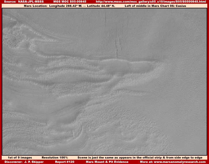 A fenti, első felvétel, a szóban forgó területet ábrázolja, pontosan ugyanabban a formában, miként az a hivatalos, S05-00845-ös katalógusszámú, keskenylátószögű felvételen megjelenik, semmiféle képfeldolgozási eljárásnak nem tettük ki, elsődlegesen éppen a túlságos mértékű kivilágosítása volt az ami szembeszökő, hiszen e beavatkozás jellegzetes eredményt ad, és természetesen azonnal gyanút kelt. Azonban a következő kép kissé már élesebb, több részletet hoz ki, megérthetjük általa, miért figyelemre méltó ez a helyszín. Megemlítjük, az első és a második felvétel egyaránt a fotócsík teljes szélességét átfogja, egyik oldalától a másikig, a vízszintesen mért átmérő pedig nagyjából 3.31 km-t tesz ki – a hivatalos adatok szerint.