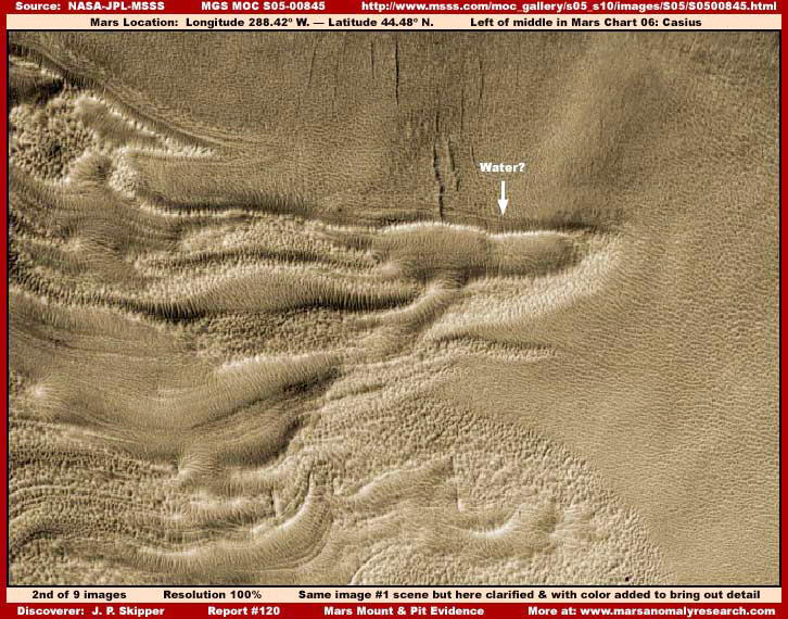 A fenti, negyedik felvétel, ugyanezen fotócsíkról való, ismét annak lejjebb található pontjáról. Itt, a legfontosabb észrevennivaló a felszíni víz, több, egymástól elszigetelt tavat alkotva, és, ami egyértelmű, folyékony, azaz nem fagyott állapotban. A felvétel méretét némileg kisebbre vettük, 90%-osra, azért, hogy a különböző területek egy felvételre kerülhessenek. Fontos megjegyezni, ez a terület a déli félteke alacsonyabb szélességi körein fekszik, a Déli Sarki terület határvidékétől északra, azaz valamivel melegebbnek kell lenni ebben a térségben ahhoz képest. Természetesen, itt a negyedik felvételen, a jobb felső sarokban látható képződmény a legkönnyebben felismerhető és beazonosítható víz előfordulási hely és elsődleges fontossággal bír ezen a felvételen. A víztározó bal oldali belső falán nagyszerűen látható a vízszint, valamint az is, ahogy az árnyékhatások a vízfelszínen megtörve miként jelentkeznek a gödör alján. A különbség oly jelentős, hogy semmiféleképpen nem keverhető össze. A vízfelszín átlátszósági tulajdonsága, valamint a vízfelületen keresztül megfigyelhető aljzat bizonyítja, a víz jelen esetben nem sekély, egyben pedig arra is igazolással szolgál, miszerint felületét önszabályzó módon beállító elegyről van szó. A fotó alján található vízgyűjtők közül a bal oldali nem annyira szembetűnő, ám továbbra is erős bizonyító erővel bír, főleg, ha alaposabban is szemügyre vesszük, mint tesszük azt mindjárt az alant következő felvétel segítségével. A tőle jobbra eső, nagyjából elliptikus alakú mélyedés szintén összegyűlt vizet tartalmaz, ám kissé nehezebben kivehető és felismerhető, külön ezért nem is vizsgáljuk meg, főleg a kép felső részén látható képződménnyel összevetve. Szenteljünk figyelmet a fehér nyilakkal jelzett folyóvíz-rendszerre is, a felső vízgyűjtő közvetlen szomszédságában, attól kissé lejjebb. A gyakorlott szem számára azonnal felismerhető, a kevésbé tapasztalt kutatók számára nem annyira. Általában ezért nem ejtünk külön szót az ilyen, nehezebben felismerhető formákról, pláne, ha könnyebben felismerhető objektumok is vannak a közelben, azonban az összefüggések jobb megértése végett itt feltétlen említést érdemel. Nem egyszerű kanyonról van szó, hanem egy jóval kiterjedtebb folyórendszerről, s ha sikerül felismerni a valós léptéket és arányokat a valós távolság tudatában, akkor megérthetjük, a jobb felső vízgyűjtő igencsak tekintélyes kiterjedéssel rendelkezik. Kissé balra és lefelé a „folyórendszer” felirattól láthatunk néhány keskeny, világos színű objektumot csoportba tömörülve. Közelebbi vizsgálat szerint esetleg épületekről lehet szó, a hivatalosan kiadott felbontás korlátai miatt azonban ebben nem lehetünk teljesen bizonyosak. Néhány közülük lehet akár a már ismert barázda-forma is, amint éppen telepet vernek ezen a helyen, esetleg mindkét lehetőség szóba jöhet. Azért említjük meg ezeket a dolgokat itt, mert mások úgyis észreveszik, s akkor rákérdeznek. Nekik is elmondhatjuk, a felbontás éppen azon a határon van, amikor már ugyan kezdünk valamit látni, de biztosat nem mondhatunk a látvánnyal kapcsolatban, mivel is állhatunk valójában szemben.