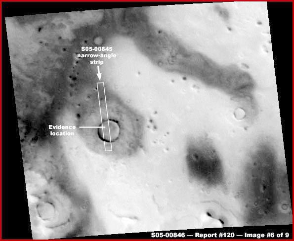 A fenti, hatodik felvétel az S05-00845 jelű keskeny látószögű fotócsík helyzetét mutatja be a tágabb környezethez képest az S05-00846 katalógusszámú széles látószögű fotón, egyben azt is leolvashatjuk róla, hogy a nevezett fotócsík miként viszonyul a kráter mélyedéséhez. Jól látható, tekintélyes méretű kráterről van szó, geológiai értelemben idős lehet, nincsenek meredek falai, s nem is túl mély. Megfigyelhetjük a kiszóródott anyag tipikus megjelenését, az éles körvonalakkal rendelkező, ám vékony kráterfalat. Nem tudunk sokat mondani erről a kesze-kusza életnyomról – a 3. és a 4. fotón a legjobban kivehető -, azonban rendelkezünk némi geológiai tapasztalattal és felismeréssel, ezt szeretnénk most megosztani a kráter-gyűrűvel illetőleg a mélyedéssel kapcsolatban. Felvetődik mindjárt a kérdés, vajon miért fontos ilyen alakzat létezése a Mars ezen régiójában? Miért fontos ez a felvetés? Azért, mert szorosan kapcsolódhat ebben a bizonyos krátermélyedésben kialakult élet milyenségéhez, különleges karakterisztikája és létrejötte folytán. Először is feltétlen el kell mondani hogy a Mars e területének nagy része általánosságban tekintve majdnem teljesen sík, ezért meggyőződésünk, hogy egykor sekély víz borította, ráadásul a közeli múltban. Mivel a víznek nem volt különösebben sehova sem lefolyása, ezért lassan elpárolgott – mélyebb részei sehol sem lehettek. Feltételezésünk szerint, akkoriban, amikor jelentősebb mennyiségű víz volt itt jelen a múltban, ha valaki belesétált volna, akár mérföldek százait is megtehette volna anélkül, hogy a derekánál jobban elmerült volna benne. Egyes helyeken talán még fennmaradt néhány igen sekély vízfolt, a legtöbb helyen azonban közvetlenül a felszín alatt gyűlt össze, a felszínt sarassá és mocsarassá téve. Egyes területek tehát ilyenek lehetnek, mások szárazabbak, keményebb felszínnel. A fenti, ötödik képen, arra gyanakszunk, hogy az erősen fényvisszaverő területek, állóvíz/sár - jelenleg is megtalálható, vagy éppenséggel a közeli múltban -, nagyon vékony rétegei lehetnek, ahol a burjánzó élet még nem tudott megkapaszkodni. Arra a megállapításra jutottunk, hogy az ötödik fotón a napfényt erőteljesebben elnyelő, sötétebb részeken az életformák fiatalabb példányait találhatjuk, mindennapos küzdelmüket folytatva a fennmaradásért, ellentétben a kissé kiemelkedő, szárazabb talajú, kedvezőbb feltételeket nyújtó részekkel. Tekintsünk ismét a mélyedésre. A feltételezés természetesen nem lehet más, mint hogy becsapódásos kráterrel állunk szemben, ám nem gondoljuk úgy, tényleg ez lenne a helyzet. A kiszóródásos terület a mélyedés körül túlságosan is közel van és mindenfelé teljességgel szabályos, textúrája egységes, ezért felmerül a kétkedés, meteor-becsapódás vajon kelthet-e ennyire szabályos alakzatot, ráadásul, hozzá kell vennünk a mocsaras terület hatását. A világűrből érkező szilárd testek pályája szöget zár be a felszínhez képest, ennek a körülménynek pedig meg kell mutatkozni a kiszóródási mintázatban. A környező kiszóródási terület itt, és számos más ponton, túlságosan is egységes szoros közelségében a kráterhez, mintázatában, és formájában, ezek a vonások pedig kulcsfontosságúak beazonosításukban. Továbbá, egyik esetben sem figyelhetünk meg jellegzetes lávafolyásokat, Kráterek – kalderák – esetében ezt az erőt vehetjük még elő természetes magyarázatként. Vulkánikus működésnél a megolvadt anyag utat tör magának és különböző lefolyási utakat követ. Ezek leghalványabb jelét sem látjuk jelen esetben, de annyi más helyszínen sem. Igen jellemző vonás. Az igazság az, a mélyedés sokkal inkább úgy fest, mintha egy hatalmas méretű gömb formálta volna, melyet óvatosan és szép lassan belenyomtak volna a képlékeny, saras felszínbe, hajszálpontosan függőlegesen, a folyamat következtében pedig felnyomódott volna a környező terület, miközben semmiféle lávafolyás nem alakult ki, ellenkezőleg, a bemélyedést feltöltötte a saras-vizes anyag – miután esetleg az objektumot magát eltávolították. Mindez természetesen teljességgel lehetetlen, a továbbiakban nem is foglalkoznánk a tökéletesen kerek kiszóródási formával, a vékony kráterfallal, hiszen pontos magyarázatot nem tudunk egyikre sem adni, pláne nem szilárd objektum becsapódásának következményeként, de vulkáni működéssel sem tudjuk értelmezni, legyen akár rövid, akár hosszú ideig tartó. Ne felejtsük el, geológiailag többé-kevésbé sík területtel állunk szemben, arra gyanakszunk, a geológiai felszín alatt gáztermelő kémiai reakciók mennek végbe, a termelődött gázok időnként hatalmas, sáros buborékokat formálnak, magukkal ragadva a jelentős víztartalmú, mocsaras anyagot, aztán lassan a felszín felé törnek alulról felfelé, eközben a magával ragadott anyag a széleken aláfolyik, köralakot öltve, aztán a buborék megsemmisül - ahogy az alulról felfelé ható nyomás gyengül -, a helyén keletkezett lyukat képlékeny anyag tölti ki. A vékony, gyűrű alakú oldalfal így jöhetett létre, mert az oda került anyag hamarabb megszáradt, a belső falán pedig a laza anyag folyamatosan erodálódik. Azaz iszapvulkánosság. Az eredmény egy nagyjából kerek és kissé kiemelkedő földhalom vagy kúp, középen minden esetben sekély mélyedéssel, mely egyben a hatalmas felemelkedő, mely elszökő gázbuborék méretét is jelzi, a Marson végbemenő különleges folyamat eredményeként, mocsaras-vizes közegben. Manapság igen ritkán, a múltban pedig gyakrabban végbemenő folyamatok miatt kialakultak ezek a sár-formálta képződmények, mint amilyenek az ötö