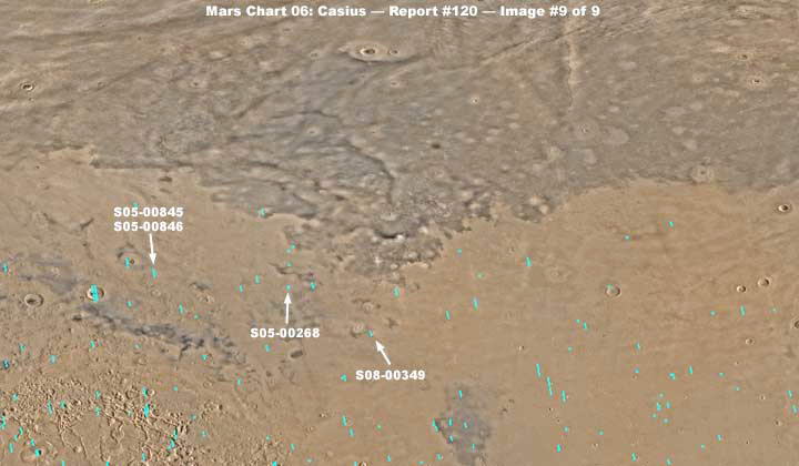 Amikor ez a folyamat végbement a sokkal távolabbi múltban, és jóval több idő telt el anélkül, hogy újabb kitörés bekövetkezett volna, a domb/mélyedés együttesek az élet szigeteiként szolgáltak. Időnként természetesen ezek az életszigetek megerősödtek és a nyitottabb területek felé törekedtek, csatlakoztak más élőmezőkhöz, az ismételten feltörő anyag pedig újabb és újabb rétegeket hozott létre, megvastagítva a saját alapjait, idővel egyre magasabbra emelve a teljes területet, összekapcsolódva más, a hegyképző folyamatban ugyancsak érintett hasonló régiókkal. Tartsuk szemünk előtt, nem minden felszín alatti, felfelé törekvő nyomóerő elegendő ahhoz, hogy áttörje a felszínt, talán csak felpúpozza, megemeli a talaj egy darabját, s ebben a formában szilárdul az meg, az élet számára még kedvezőbb feltételeket teremtve, e magasabb részen. A fenti, nyolcadik felvétel egy különböző, az S08-00349 katalógusszámú széles látószögű fotócsíkból származik, ezt a bizonyos hosszabb ideig tartó folyamatot illusztrálja, amint a sötét színű, a fényt jobban elnyelő életformák szétterjednek a domb-szigetekről, ahol a magasabb felszín kedvezőbb feltételeket nyújt a fennmaradáshoz, ám továbbra is lakatlan a vízzel/kémiai anyagokkal telített, erősen fényt visszaverő, igen fényes terület, miközben éles határt láthatunk sötét és a világos régió között. Amiről ugyancsak nem szabad elfelejteni, az az, hogy természetesen vannak valódi becsapódásos krátermélyedések is ezen a vidéken, azonban az itt bemutatott, a kitörésekre utaló nyomok, jóval számosabbak. Felvázoltunk egy elméletet a dombok/mélyedések eredetével kapcsolatban, számos év kutatói háttérrel a hátunk mögött, tapasztalatokra építve, természetesen, ettől még lehet hibás. Az itt megfigyelhető nyomok és megfigyelések arról mesélnek, hogy a Marson igen nagy területek találhatók, sekély vízzel és/vagy sárral fedve, miként ebben a régióban is mindenfelé, a víz pedig telítődik saras talaj-összetevőkkel. A feltételek összejátszása pedig kialakítja a megfigyelhető domb/mélyedés formákat. A tudósok természetesen kétségtelenül és igen gyorsan rámutatnak majd, hogy ahol saras területeket látunk ott valójában száraz és kietlen sivatagok vannak, magyarázván az erős fényvisszaverő képességet és az élet hiányát. Hasonlóképp, ahol sár alkotta kiszóródási mintázatot látunk a krátergyűrűhöz igen közel, a túlfolyásos jelenség eredményeként, ők továbbra is becsapódásos krátereket fognak látni, vagy, legutolsó esetben, geológiai eredetű lávafolyásokat. Ugyancsak, ahol biológiai életnyomokat látunk a sötétebb területeken, ők csak alapjában különböző talaj összetevőkről beszélnek. Emlékeztetésképpen, mindezek csak elméletek, a mienk és az övék is, és nem keverendők össze valós tényekkel, egyik oldalon sem. Az egyetlen ténnyel ezek a távoli és különös kinézetű dombok és bemélyedéses területek szolgálnak, ahogy azokat a műholdas felvételeken megfigyelhetjük, itt csak néhány példát bemutatva, létezésük pedig nehezen magyarázható a hagyományos földi elképzelések alapján. Miként említettük, a szóban forgó dombok és mélyedések láthatóan igen nagy távolságban vannak. Bárki könnyen felismerheti őket a mélyedéshez viszonylagosan közeli és egységes képet mutató kiszóródási területről, a vékony és erőteljes kráterfalról, valamint a következetesen sekély és viszonylag sík kráterfenékről, jelentős eltérést mutatva a tipikus becsapódásos kráterek általában mélyebb aljzatához képest. A Marson további, kör alakú bemélyedések is vannak, melyek ugyancsak nem becsapódásos kráterek, annak ellenére sem, hogy gyakran, helytelenül, összekavarják őket velük, a jóval mélyebb belső területeik miatt. Megvan a maguk különleges magyarázatuk, a Mars ezen, viszonylag sík területén azonban eredetük teljeséggel eltérő az említettekhez képest.