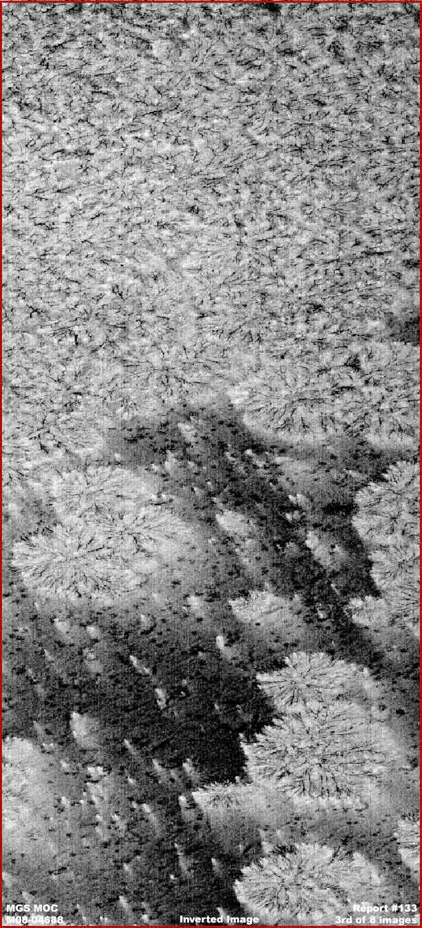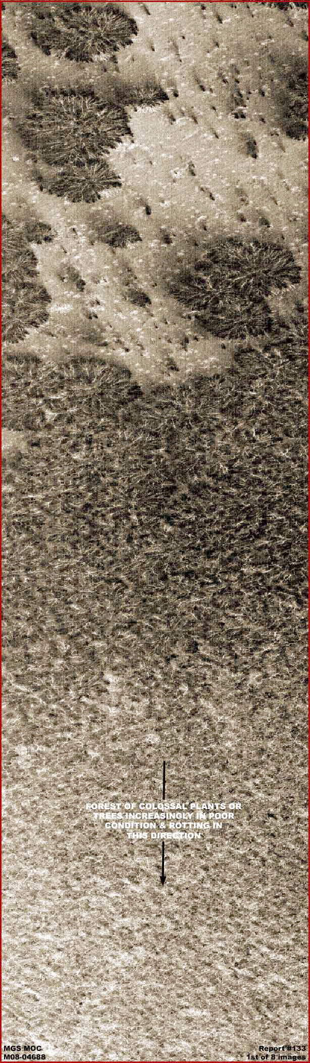 A fenti, első kép a már régebbről ismert MGS MOC M08-04688 jelű fotócsíkból való, a hivatalos oldalon a sorban a harmadik, keskeny látószögű, egyenes állású GIF kép. Láthatóan, már a hivatalos szervek részéről, fordított állapotban, legalábbis ami a listán szereplő első és második felvételt illeti, ugyanerről a helyszínről. A hosszú fotócsík az egyik oldalától a másikig a hivatalos statisztikák szerint 2.83 km széles. A térség az eredeti fotón kissé jobban látszik, a file-méret azonban hihetetlenül nagy volt, a sok-sok egyedi objektum tömegének köszönhetően; a számítógépes program képes volt ezeket felismerni. Nagymértékű tömörítést alkalmaztunk tehát, hogy senkinek ne legyenek letöltési nehézségei, a file-méret azonban még így is eléggé nagy. A kép látványa tehát kissé kimosottnak tűnik. Ennek ellenére, kontext felvételként szolgál a főbb látvány bemutatására. Figyeljük meg, miként tekintetünket vándoroltatjuk a fotó tetejétől az alja felé, eleinte hatalmas és egészséges példányokat látunk, egyre sűrűbben elhelyezkedve, de még a legsűrűbb részeken is egyedileg beazonosíthatóan, majd tovább lefelé menvén beteges, sőt halódó állapotban látjuk őket, szétrohadva és darabjaikra hullva a fotó legalján. A legegészségesebb részt szemügyre véve az a benyomásunk támad, hogy bizonnyal kolosszális méretű növényeket látunk, nem pedig fás jellegű egyedeket (legalábbis ahogy mi ismerjük), követik a korlátozott mennyiségben rendelkezésre álló vízpárát és ásványi anyagokat, felhasználván azt, és kihalnak a túlnépesedett részeken, ahol a nyersanyagforrások már nem képesek ilyen tömegű egyedet ellátni, kimerülnek. Figyeljük meg a növényeket és nagyon hosszúra elnyúló ágaikat, úgy tűnik, elsősorban vízszintesen terjeszkednek egy központi helyről. A fő ágak láthatóan erősek, hangsúlyos és vastag tövük van, s kellően méretesek ahhoz, hogy megjelenjenek a visszaverődő napfényben, miként a sok-sok másodlagos, a tőből szerte ágazó ág. Figyeljük meg a sötétebb, az ágakhoz kapcsolódó lombozatot. Eltekintve az itt látható hatalmas méretektől, mindez jellemzőnek mondható agresszívan növekvő növények esetében, burjánzó, nagy egyedsűrűségű erdőség esetében, miközben úgy igyekszenek növekedni, hogy minél több napfényhez jussanak, a többieket a peremvidékre szorítva, legalábbis egy darabig, ahol keményebbek a feltételek. A fentiek természetesen erdei viszonyokra érvényesek, de mi a helyzet közvetlenül a burjánzó vidék felett, ahol a legnagyobb egyedi példányok figyelhetők meg, némileg elszigetelve? Nézzük is meg egy mintafelvételen alább, hogy miről is van szó.