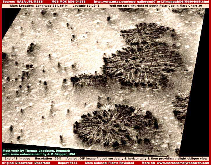 A fenti, második felvétel újnak számít a honlapon és némileg közelebbi rálátást tesz lehetővé az egyedi növényekre. A hivatalos adatok közül a második helyen listázott, szög alatt látható GIF tudományos képi adat az MSSS részéről, már hivatalis szinten elforgatták az egyenes állású, az első helyen beillesztett, némileg más perspektívával szolgáló GIF fotócsíkhoz képest. A legfontosabb üzenete a fotónak, hogy némileg ferde nézőponttal szolgál, így, a napfénynek köszönhetően kissé 3D benyomást kelt, azaz kissé jobban észlelhetjük a kiemelkedő részeket. Thomas Jacobson, grafikus programozást oktató egyetemi tanár, Dániából küldte ezt a képet Skippernek évekkel ezelőtt. Most itt látható beillesztve a sorba, némi képjavítási alkalmazást követően. A felvétel szerint a rajta látható formák nem sokkal emelkednek a talajszint fölé, miként azt az általunk ismert fák teszik, sokkal inkább vízszintes növekedést mutatnak, alacsonyan a föld felett. Néhány ezek közül az ágak közül nem tűnik teljes egészében meggyőzőnek. Miközben a növényzet egyedei nagyon jól kivehetők, a környező felszín jelentősen eltér. A fotócsík felbontása meglehetősen rossz, a felszíni formák emiatt jelentősen sérülnek, kisebb részleteik teljességgel kivehetetlenek, csak a hatalmas méretű objektumok ismerhetők fel, az alap geológiai nem más mint egy összemosott maszatolás. Jó esélye van annak, hogy egy e bizonyos „felszín” semmi más, mint közönséges képhamisítás, tovább súlyosbítva a felvétel alapvető problémáit. Mindezek miatt, habár ezek a változtatások jelentősen befolyásolják a látványt magát, mégsem gondoljuk, hogy a növények jelentősen a talajszint fölé emelkednének. Sőt, az álláspontunk az, hogy sekély vízben pihennek, ezáltal is könnyítve az ágak önhordó képességét, és éppen ez a víz az, amit a képhamisítási eljárás során eltüntetni igyekeztek, a fényvisszaverő-képességét könnyedén felismerte a számítógépes program és jónak látta beavatkozni, ám nem rejtette el a növényeket, mivel minden bizonnyal korábbi fejlesztés, az MGS MOC fotók feldolgozásának terén, erre a feladatra akkoriban még nem volt képes, ezeket az aránylag szabálytalan formákat; a későbbi fejlesztések már bizonyára tudják. Akárhogy is, vegyük alaposan szemügyre a fenti, második felvételt, és igyekezzünk jól megjegyezni a növények alakját és részleteit, különösen ami a lombkoronát illeti. Mindez nagyon fontos lesz amikor a későbbiekben elkezdjük vizsgálni az MRO fotóit, melyek egészen másként festenek.