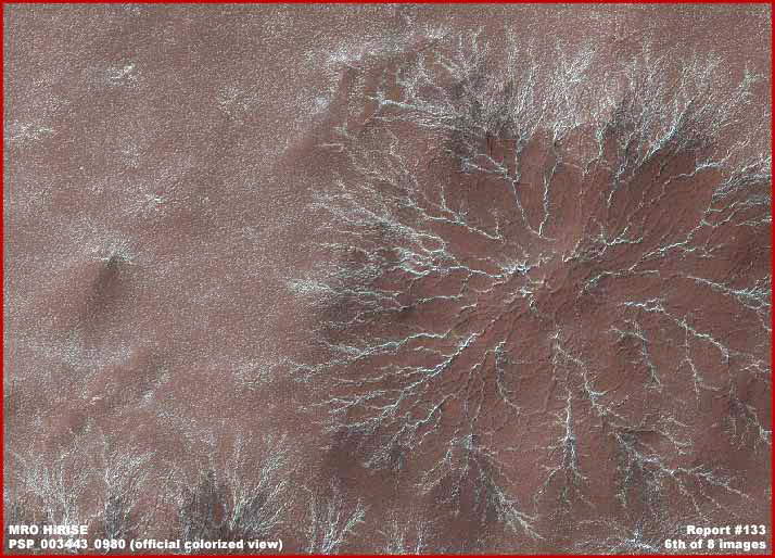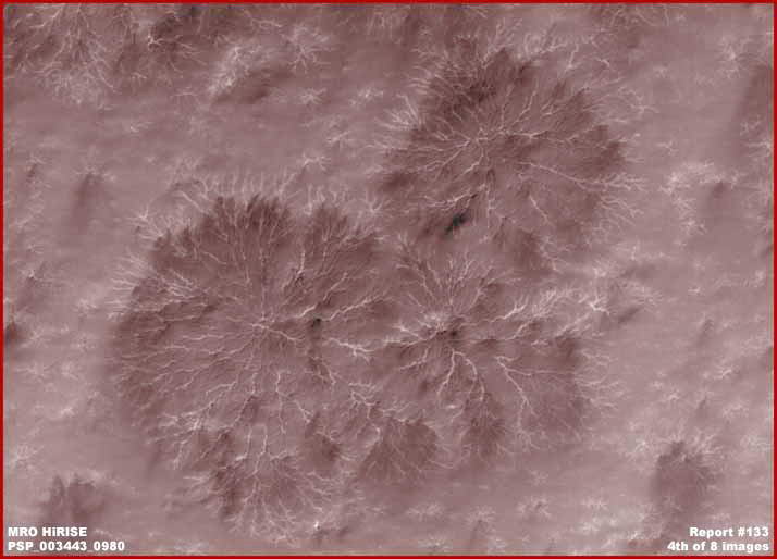 A fenti, hatodik felvétel egy részletét ábrázolja az MRO PSP_003443_0980 hivatalos megjelölésű hamis színes felvételnek. A hamis színeket az elsődlegesen nyilvánosságra hozott MRO felvételekhez adták, a növényzet elrejtésére. A hivatalos értelmezés szerint a fehér vonalak „Kitörési Csatornák”, miként azt a hivatalos tudományos szervektől annyi esetben hallhattuk, s „természetesen” a talajba fagyott széndioxid jég szublimációja, azaz párolgása okozza, eközben jönnek létre a felszínen a „csatornák”. Hasonlítsuk össze ezt a geológiai működést sugalló pszichológiát az első és második felvétellel, ahol a biológiai élet nyomait látjuk. Elég drámai a különbség, nem igaz? Holott pontosan ugyanarról az alakzatról van szó. Mindenki egyéni választásán múlik, miként határoz önmagában. Melyik a valódi alakzat és melyik nem? Egyértelmű, hogy mindkettő nem lehet egyaránt igazi, és nem is keverhetők össze, mintha egyikük valamiféle véletlen eltérés lenne a tudományos adatok között. Nagyon közelről vizsgáljuk meg a második felvételt, hangsúlyosan megjelenik rajta a biológiai élet üzenete, a növény hatalmas tövével, a belőle szétágazó ágrendszerrel és lombkoronával; azaz a növényi jellegű élet jellemző vonásaival. Nem tökéletesen kivehető, ám az említett forma ott van a képen. Most nézzük meg ugyanilyen közelről a fenti hatodik fotót. Eközben vegyük észre az ágak között a rozsdavörös szín egyöntetűségét, miként válik enyhén sötétebbé és jellegtelenebbé az ágak között, mint a környező területeken. Ez a „beavatkozás” egy létező forma megjelenésébe, amikor felhasználják a főbb vonásait és a mellékes elemeket változtatják meg, az egész látványt is módosítja természetesen, elrejtik az eredeti állapotokat – sajnos teljességgel bevett gyakorlat a műholdas és a felszíni robotok által készített felvételek meghamisítása során. A titkos hatalom általában nem túl gyakran esik olyan hibába, amikor valamilyen információ – szándékukkal ellentétben – nyilvánosságra kerül. Ilyenkor meghagynak valamit belőle, a többi elemet megváltoztatják, azaz meghamisítják a felvételt, és máris harsogják, hogy nem, nem! Úgy gondoljuk, a jövőt illetően ez a helyzet változni fog. A rendkívül finom felbontás mellett és a sok-sok év számítógépes térképezési gyakorlattal a hátuk mögött, kifejlesztettek rendkívüli intelligenciával, akár már mesterséges intelligenciával rendelkező számítógépes megoldásokat is, ezek pedig kolosszális méretű adatbázisokból építkezhetnek, mindenfajta világ mintázatát megismertethetik velük, azaz a jövőben megjelenő fotók immár teljes egészükben mesterségesek lesznek, azaz hamisak. A kaput végérvényesen bezárják az igazság nyilvánosságra jutása előtt. Ennek az útnak láthatjuk most már a majdnem végállomását. Érdemes azt is tudni, hogy a fenti, hatodik felvételen látható alakzatokat az MRO felvételén mint „pókokat” azonosították be, elsősorban megjelenésük alapján. Ennyi erővel azt is hozzátehetnék mások, hogy ezeket a pókokat nem más, mint ívkisülések hozták létre. Elsőre meglehetősen különös értelmezésnek tűnik, ám léteznek a Földön ilyen alakzatok, ha jóval kisebb léptékben is. A „pókok” összekapcsolása elektromos ívkisülésekkel számos akadémikus és tudós körben sokkal elfogadhatóbb magyarázat ezen alakzatok beazonosítására, hiszen az ilyen jellegű besorolás geológiai eredetű kapcsolatokat feltételez, ez pedig megfelel a hivatalos szervek ízlésének, hiszen messze elkerüli a számukra elfogadhatatlan, a marsi életre vonatkozó felvetést. Nem mondhatjuk azt, hogy néhány alakzatot ezek közül nem elektromos ívkisülés hozott létre. Azt azonban igenis határozottan kijelenthetjük, az MRO nagyfelbontású kamerája által küldött adatok között, különösen pedig a legújabbakat figyelembe véve, ezek az azonosítások rendszerint alátámasztják, hogy a felvételeket szándékosan meghamisítják és összezavarják, ezeket a beavatkozásokat pedig nem tudják felülírni a melléjük adott magyarázatokkal. Véleményünk szerint a hivatalos következtetések nagyon is ingatag lábakon állnak, súlyos hibákat követnek már az előfeltételezések során. Ám mielőtt ebbe belemennénk, nézzünk néhány további képi információt.