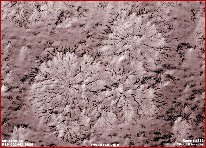 A fenti, harmadik, hosszabb felvétel mindösszesen az első felvétel fő részét ábrázolja, itt azonban fekete-fehérben, színek nélkül. Átfordítottuk negatívba az elkövetkező MRO képek könnyebb értelmezése céljából. Figyeljük meg a negatívba fordítás miként hat a növényzet megjelenésére, mennyire más lesz. Ami mélyebbnek látszott az most kiemelkedik, ami pedig a napfényt erősen visszaverő területnek mutatkozott, az most éppen ellenkezőleg. Nézzük most ezt meg a világos színű, a napfényt tükröző hatalmas tövekkel kapcsolatban, most ugye sötétek, és kiemelkedés helyett, árok-jellegűnek tűnnek. Habár a nevezett hatást távolról és rossz felbontás mellett vehetjük szemügyre, pusztán érzékeltetni szeretnénk, milyen következményekkel jár egy felvétel negatívba fordítása, miként hat az egyes objektumok megjelenésére. A fenti, negyedik felvétel, a jelenleg is működő MRO nagyfelbontású PSP_003443-0980 jelzésű fekete-fehér tudományos képi adata. Figyeljük meg, hogy az MRO nagyfelbontású fotója ellenére, a helyszín zavaros, homályos, mintha párás lenne. Skipper úgy döntött, nem veti alá a felvételt tisztításnak, hogy mindenki láthassa, miként fest az eredeti tudományos JPEG, a böngészők által elérhető felvétel. A formák hivatalos leírását az alábbiakban olvashatjuk, a kép mellékleteként jelent meg: „Ez a felvétel részét képezi a 2007-ben bemutatott ’Tavasz a Mars Déli Pólusán’ – című AGU előadásnak. Átlátszó széndioxid-jég fedi a Mars sarki területeit időszakosan. Felmelegszik és elpárolog, a felszabaduló gáz pedig számos, csatorna-jellegű formát hoz létre. A példánkban a csatornák csillagszerű mintázatot követnek, tollszerűen kiterjedve. A mintázat közepét betemette a por és ugyancsak friss por ülepedett le a szélső részek környékén is. Növekvő geológiai alakzatra láthatunk tehát példát, amikor új csatornák jönnek létre, miközben a régiek feltöltődnek, s így nem tudják többé hatékonyan elvezetni a felszabaduló gázt.” Íme, a hivatalos értelmezés gyorsan megmagyarázza, hogy mi valójában a növényi alapú biológiai élet, és ugye nincs is a továbbiakban min gondolkozni. Mindenki természetesen felfogta a sugalmazást, „széndioxid”, erőltetvén és sulykolván, nehogy valaki megfelejtkezzen róla, a Mars légköre elsődlegesen, azaz 95.35%-ban széndioxidból áll, s természetesen minden általunk ismert életformára halálos veszélyt jelent. Ugyanígy, a széndioxid jég említése emlékeztet bennünket a marsi extrém fagyos körülményekre, arra, hogy az általunk ismert mindenféle életformára végzetes. Gondoljuk, mindenki észrevette a „por” említését is, a hivatkozás természetesen szándékos, hiszen célja a koncepció megerősítése, a Mars poros, száraz és halott világ. Más szavakkal, szembetalálkozhatunk a hivatalos pszichológiai törekvésekkel. Lenne bárki is, aki még mindig nem érti? Akkor bizony jobban oda kell figyelni! Ha valaki nem teszi, az említett lélektani fogások 100%-osan érvényre juthatnak.