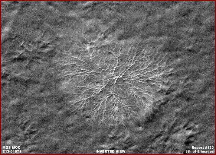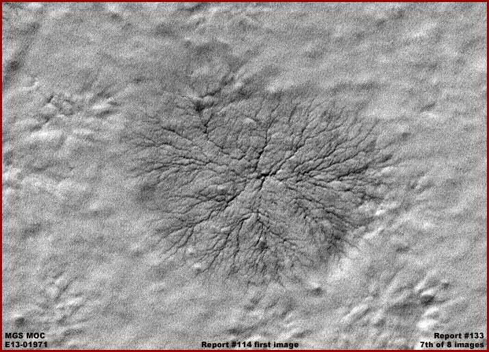 A fenti, hetedik felvétel az MGS MOC E13-01971 katalógus jelzésű, keskeny látószögű hivatalos adatcsík, újabb példát mutat be, a hivatalos látványt adjuk tovább a szóban forgó alakzatok egyik magányos példányára. Színezett változatával találkozhatunk a 2007-ben megjelent, „A Mars erdőséginek biológiai sokszínűsége” – című beszámoló fotómellékletei között az első. Figyeljük meg a „csatorna-hatást”, miként sugárzódnak szét egy középpontból. Vegyük észre, mennyire hasonlít a jelen beszámoló harmadik, negatívba átfordított felvételéhez, valamint az ötödik képhez, mellyel kapcsolatban ugye meg kell jegyezni, hogy az a hivatalosan kiadott változat, s nem pedig az általunk negatívba átfordított.