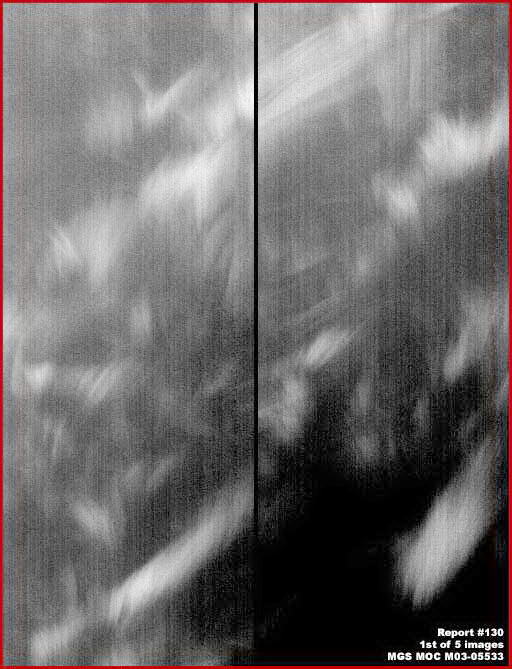 A fenti, első kép az MGS MOC M03-05533 jelű, keskeny látószögű fotócsík felső 20-25%-át ábrázolja. A helyszín magasan fent található az Északi Sarkvidék területén, ahol egy jelentős bemélyedés „harap bele” mélyen a jégsapkába. A fenti osztott képen a jobb oldali rész közvetlenül a bal oldali alatt kezdődik. Nehéz bármiben is biztosnak lennünk egy ilyen kifejezetten rossz felbontású képen, valószínűleg valamilyen légköri jelenségnek lehetünk tanúi az űrszonda és a felszín között. Ha így van, akkor semmi másról sincs szó, mint a napfény visszaverődéséről a marsi légkörben különböző magasságokon lebegő jégkristályokon. Egyúttal azt is elmondhatjuk, marsi légköri jelenségről van szó, talán hasonló dologról, mint a földi északi féltekén az északi fény, a légkörben található kristályokon tükröződő napfény kapcsán, ám ezúttal nem alulról látjuk, hanem felülről? Akármi is ez, meglehetősen ritka eseményről van szó, hiszen ez az egyetlen ilyen jellegű felvétel s sok-sok ezer között, melyeket Skipper eddig megvizsgált.