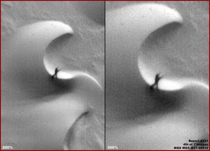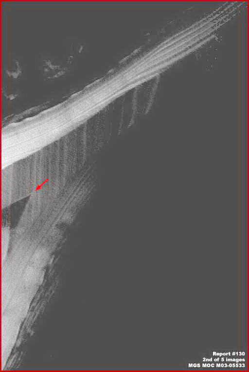 A fenti, második felvétel ugyanennek az MGS MOC keskeny látószögű M3-05533 GIF fotócsíknak a középső része feletti tartományát ábrázolja, az eredeti méretéhez képest kétszeresére nagyítva. A helyszín a részleten az első kép alatti területet mutatja. Ha helyesen értelmezzük a tátottakat, akkor az Északi Jégsapka egyik kiemelkedő részét vehetjük szemügyre, egyfajta félszigetként tárul a szemünk elé, mindkét oldalán jelentős mélység övezi, nemcsak az árnyékhatás miatt látjuk sötétnek, hanem azért is, mert a mély területeket sötét színű anyag borítja, miáltal az egész helyszín még sötétebbnek mutatkozik. A piros nyíl a fenti, második képen, egy jól körülhatárolható, éles körvonalakkal rendelkező ék-alakú formára mutat. Nem lehetünk teljes mértékben meggyőződve arról, mit is látunk, annyit talán leszögezhetünk, hogy átmeneti állapotról van szó, ráadásul árnyékos területen, a következő fotón még szemre vételezhetjük ugyanezt a részt, aztán hiába is keresnénk többet, ez a természeti alakzat ismételten már nem bukkan fel sehol a helyszínről készült képeken. Az újabb, ugyancsak szerény felbontású felvételt csak azért illesztettük be ide, hogy bemutassuk, ugyanerről a területről van szó, mint amit az első is láthatunk.