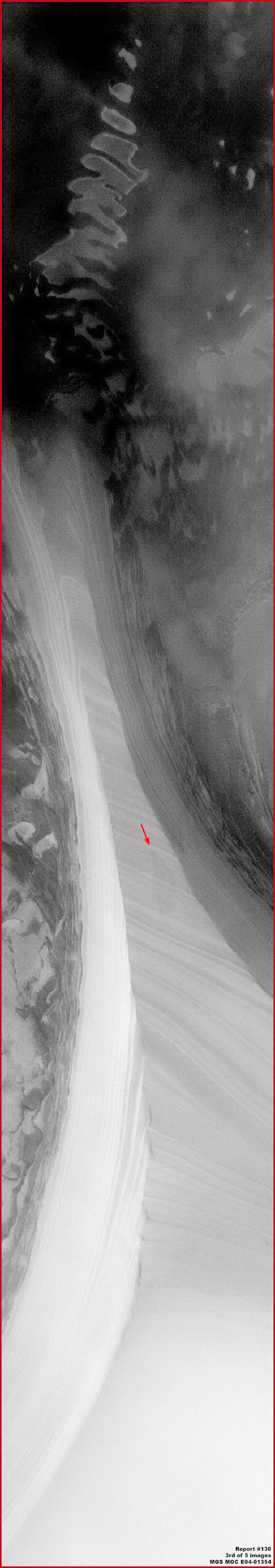 A fenti, harmadik felvétel az MGS MOC E04-01354 jelzésű keskeny látószögű fotócsík középső vidékének alsó részét ábrázolja, egyenes állású GIF kép, pontosan abban a formájában, miként az a hivatalos oldalon megjelenik, semmit nem változtatott rajta Skipper a jobb alsó sarokban lévő felirat és a keskeny keret felvitele kivételével. Már előre felhívnánk egy figyelmet egy optikai csalódásra, eszerint úgy tűnik, mintha a piros nyíllal jelzett világos színű terület alá bukna a sötétebb színű, vele határos anyagnak, jobb oldalt. Azonban a helyzet az, hogy az erősen világos színű anyagnak magasra kiemelkedő hatalmas félszigetét láthatjuk itt, egy igen sötét anyagot tartalmazó mélyedésből az ég felé törve. Önmagában nem számít rendkívülinek, ami mégis rendellenes, az az éles határvonalban végződő gerinc, még akkor is, ha minden bizonnyal az Északi Jégsapka fagyott jegéből állt össze. A geológiai felszínben nincs semmi szokatlan.